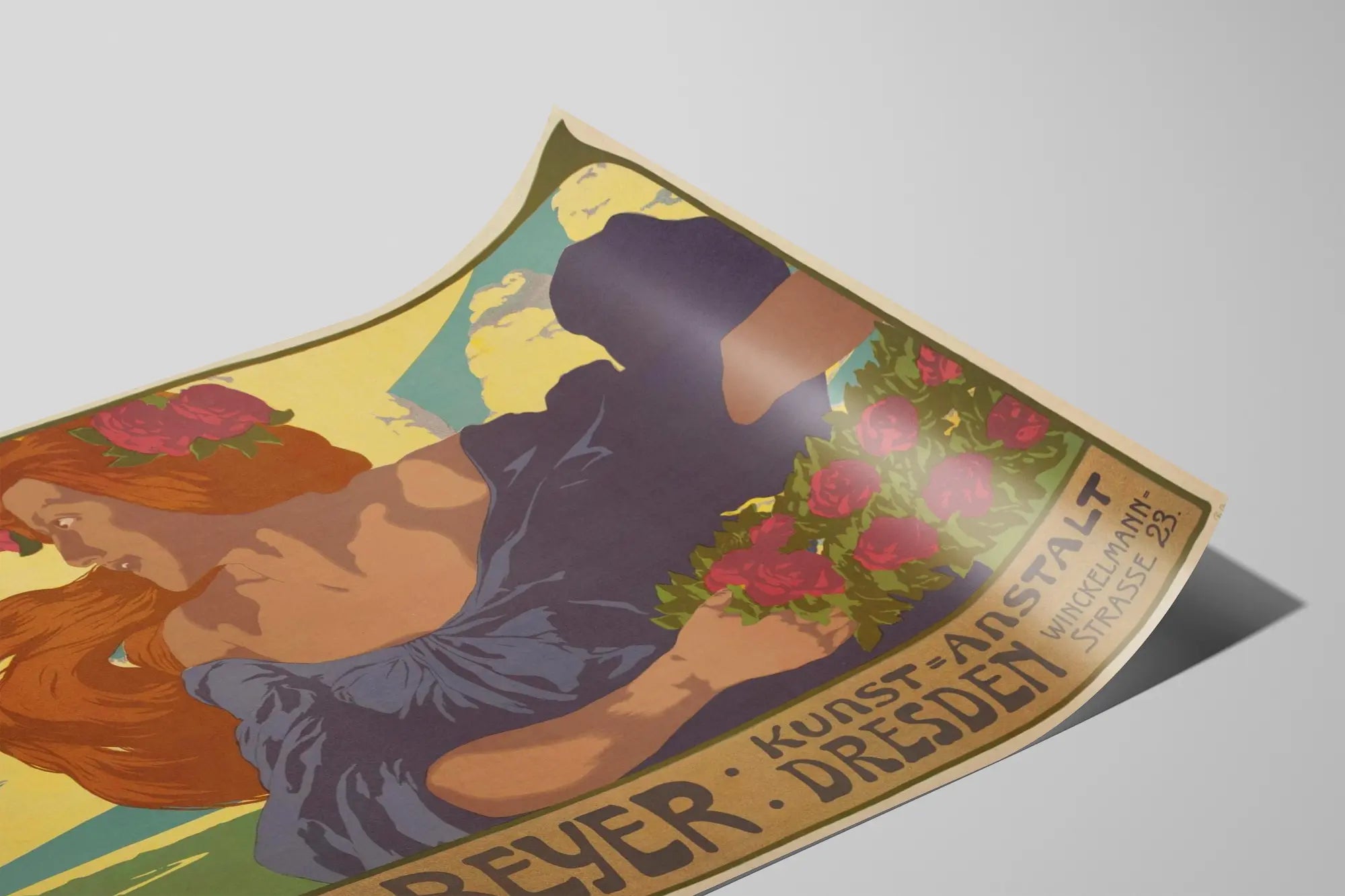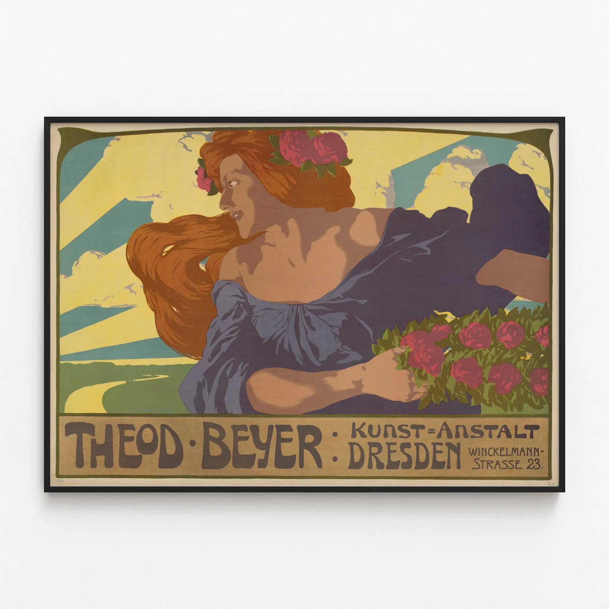 Deze vintage poster toont een jonge vrouw met een delicate gezicht, rood haar versierd met rode bloemen, in een illustratieve stijl typisch voor het begin van de twintigste eeuw. Ze wordt afgebeeld in een dynamische beweging, gericht naar rechts, terwijl ze een boeket heldere rozen vasthoudt, met een lichte achtergrond van de lucht en gestileerde landschappen. Het grafisch ontwerp benadrukt een harmonieuze balans tussen warme en koude kleuren, waaronder het blauw-grijze van de jurk en de rode rozen die contrasteren met een stralende gele achtergrond en geometrische vormen in de lucht. De tekst "THEOD. BEYER KUNST-ANSTALT DRESDEN" verschijnt in brede letters, waardoor een kader ontstaat dat doet denken aan een affiche uit vervlogen tijden. Deze poster kan perfect dienen als muurdecoratie in een interieur met een retro- of art nouveau-stijl, en brengt een artistiek en historisch accent. Dit wanddecoratieve element is ideaal voor liefhebbers van oude affiches, illustratieve posters en unieke grafische composities. Of het nu gaat om het verfraaien van een woonkamer, kantoor of tentoonstellingsruimte, deze poster biedt een ware visuele reis door het ontwerp en de reclamekunst van vroeger.