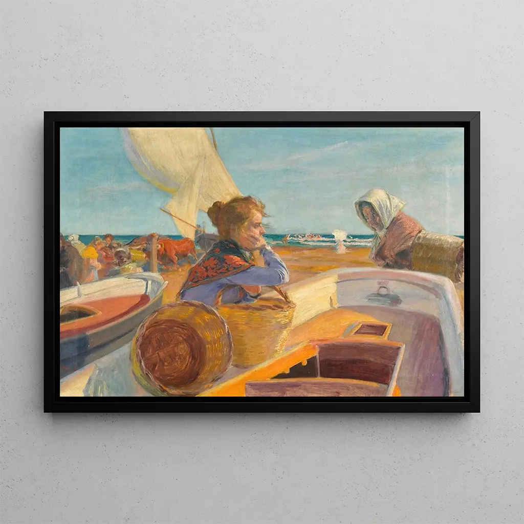 De kunstdruk "In afwachting van de visserij" vangt een rustige scène, waarin de tijd lijkt stil te staan. De nuances van blauw en groen roepen de rust van een meer op, terwijl de reflecties van het licht op het water een bijna magische dimensie toevoegen aan het geheel. De figuren, bevroren in hun wachten, brengen een sfeer van kalmte en contemplatie over. Dit doek nodigt de kijker uit zich voor te stellen aan de waterkant, dit moment van sereniteit en harmonie met de omringende natuur te delen.