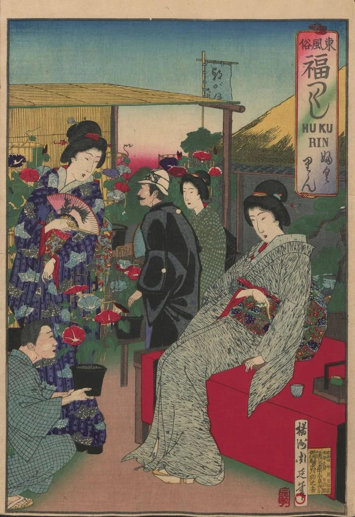 In deze kunstdruk van L'Album de Nishikie Pl22 dompelt Toyohara Chikanobu ons onder in een wereld vol kleuren en details. De compositie benadrukt elegant geklede personages die zich bewegen in een delicate natuurlijke omgeving. De fonkelende tinten, variërend van diepe roodtinten tot rustgevende groenen, creëren een sfeer die zowel dynamisch als sereen is. De ukiyo-e-techniek, met haar vloeiende lijnen en verfijnde patronen, brengt deze scène tot leven en nodigt de kijker uit om zich onder te dompelen in de vergankelijke schoonheid van het dagelijks leven in Japan.