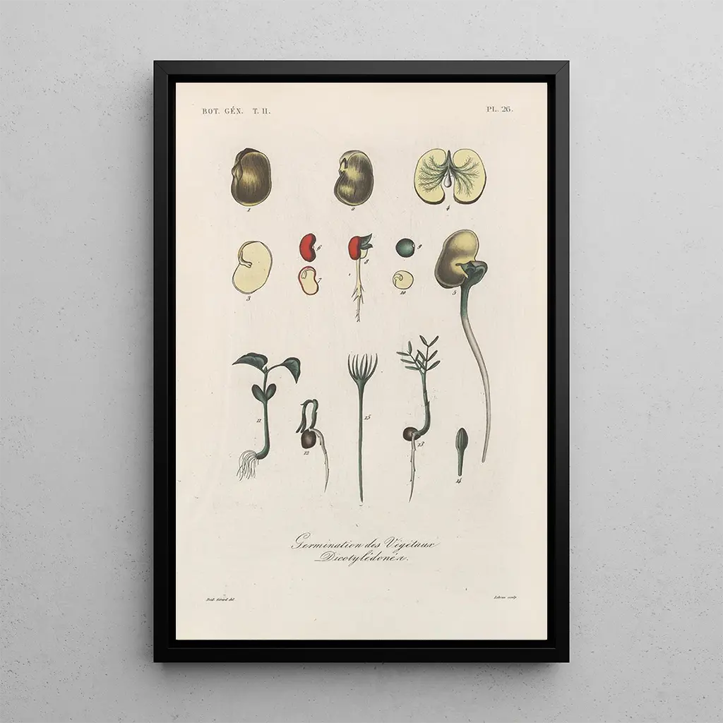 La kunstdruk du tableau Traité de botanique générale Pl077 nous plonge dans un univers où la nature est mise en lumière avec une délicatesse remarquable. Les couleurs vibrantes et les détails minutieux des plantes illustrées créent une atmosphère apaisante et contemplative. Chaque élément de la composition, des feuilles délicates aux fleurs éclatantes, est soigneusement agencé pour inviter le spectateur à apprécier la beauté du monde végétal. La technique employée, probablement à l’aquarelle ou à la gouache, confère une légèreté et une transparence à l’ensemble, rendant l’œuvre presque vivante.