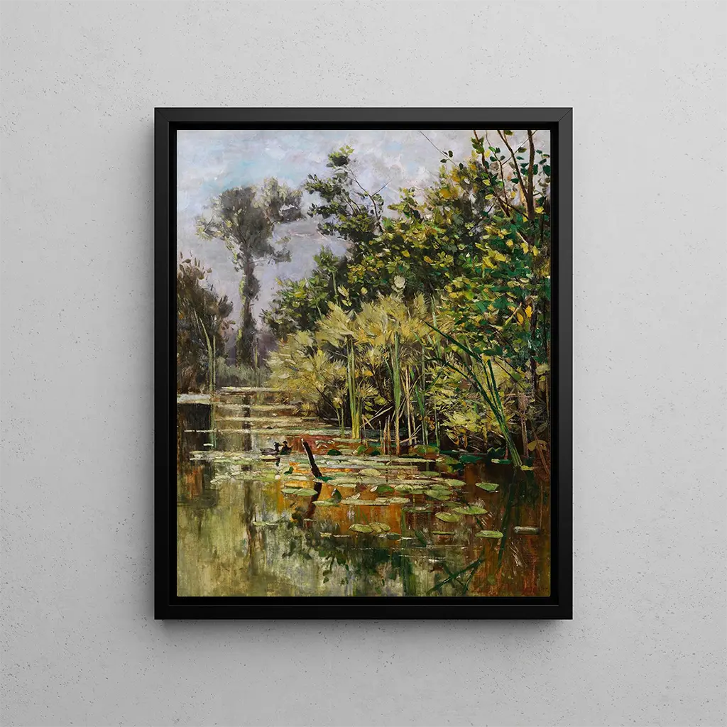 Karl Hagemeister is een Duitse landschapsschilder uit de 19e eeuw, bekend om zijn poëtische weergaven van de natuur. In 'Altwasser met eenden in de herfst' legt hij de serene schoonheid vast van een herfstlandschap, waar het gouden zonlicht zich weerspiegelt op het rustige water, wat een rustige sfeer creëert. De eenden, die een vleugje leven aan de scène toevoegen, zijn met bijzondere zorg geschilderd, wat getuigt van de minutieuze observatie van de kunstenaar. Dit werk, dat een viering van de natuur is, roept ook gevoelens van nostalgie en rust op. Vandaag kan het een warme en uitnodigende sfeer brengen in elke binnenruimte. Wij nodigen u uit om de kunstdruk van dit werk te ontdekken op Artem Legrand.