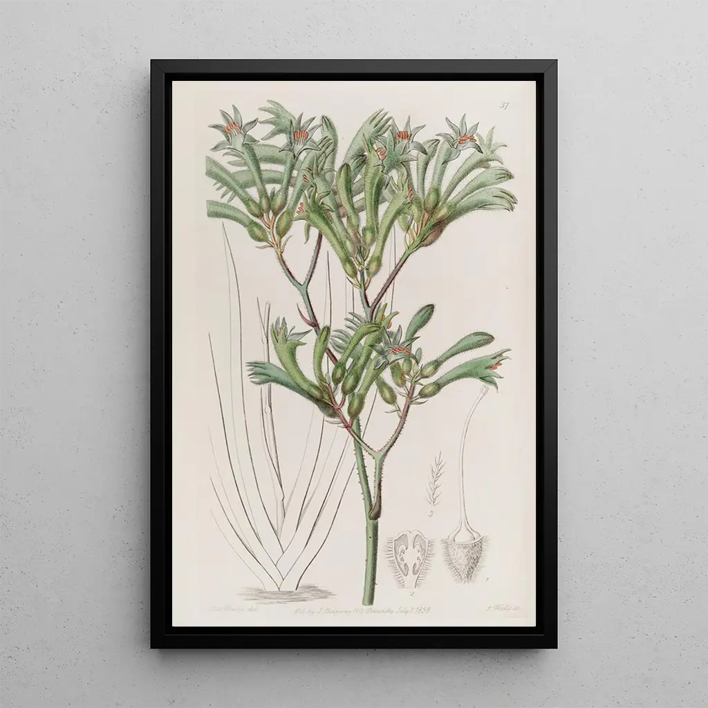 De Amigozanthus met gele haren, geïllustreerd door Sydenham Edwards, onderscheidt zich door zijn levendige tinten en unieke textuur. Dit kunstwerk benadrukt de bijzondere schoonheid van deze Australische plant, waarvan de felgele bloemen contrasteren met het weelderige groen van de bladeren. De graveertechniek die Edwards gebruikt, maakt het mogelijk om elk detail met verbluffende precisie weer te geven, waardoor deze kunstdruk tot leven komt. De sfeer die van dit doek uitgaat, is zowel vrolijk als rustgevend, en nodigt uit tot een aandachtige contemplatie van de rijkdom van de natuur.