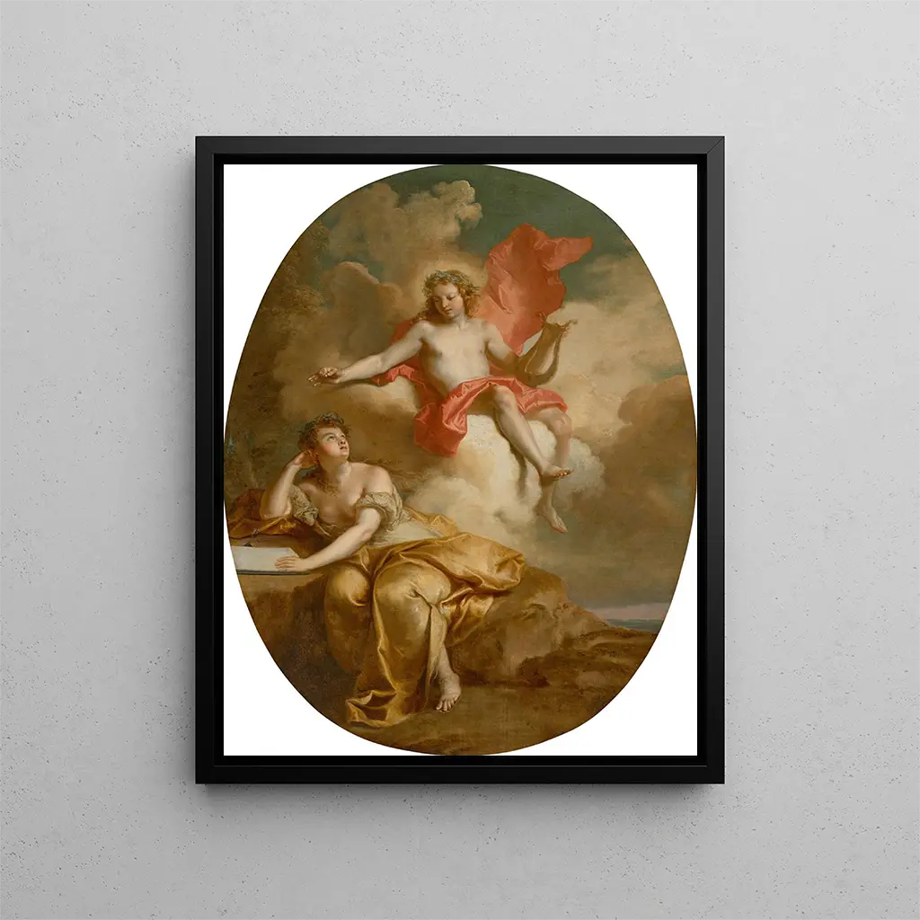 Reproductie Apollon en een muze - Auger Lucas – Boeiende introductie L'œuvre "Apollon en een muze" van Auger Lucas roept een universum op waar mythologie samenkomt met de tijdloze schoonheid van kunst. Dit schilderij, dat binnen een klassieke traditie past, brengt ons naar het hart van een scène waar goddelijke kracht en artistieke inspiratie verweven zijn. De voorstelling van Apollon, god van de kunsten en het licht, naast een muze, symboliseert de zoektocht naar creativiteit en de harmonie tussen mens en goddelijke. De fijnheid van de details en de keuze van kleuren nodigen de kijker uit om deze fascinerende ontmoeting te bewonderen, zowel spiritueel als esthetisch, die de tijden overstijgt. Stijl en uniekheid van de kunstdruk De stijl van Auger Lucas wordt gekenmerkt door een opmerkelijke beheersing van clair-obscur, een techniek die de vormen en volumes benadrukt. In "Apollon en een muze" lijkt het licht uit het centrale personage te stralen, waardoor de delicate trekken van de muze worden verlicht en de nobelheid van Apollon wordt versterkt. De zorgvuldig uitgevoerde plooien tonen een dynamiek van beweging, die zowel gratie als kracht suggereert. De kunstenaar slaagt erin de essentie van zijn personages vast te leggen, die bijna levend lijken, klaar om tot leven te komen onder de oplettende blik van de kijker. De compositie is in balans, elk element vindt zijn plaats en draagt bij aan de algehele harmonie van de kunstdruk. Deze artistieke aanpak maakt van "Apollon en een muze" een uniek stuk, waarin elke penseelstreek een verhaal, een legende, een emotie vertelt. De kunstenaar en zijn invloed Auger Lucas, schilder uit de 19e eeuw, wist te navigeren tussen de artistieke stromingen van zijn tijd, terwijl hij een stijl ontwikkelde die hem eigen is. Geïnspireerd door de meesters van de Renaissance en de principes van het neoclassicisme, wist hij elementen uit de moderne tijd te integreren in zijn praktijk. Zijn werk beperkt zich niet tot eenvoudige voorstelling; hij probeert gevoelens op te roepen, een reflectie te stimuleren over de menselijke conditie en de relatie met kunst. Lucas was ook een gepassioneerde docent, die zijn kennis doorgaf aan jonge kunstenaars en zo bijdroeg aan de bloei van de artistieke scène van zijn tijd. Zijn invloed blijft voortbestaan.