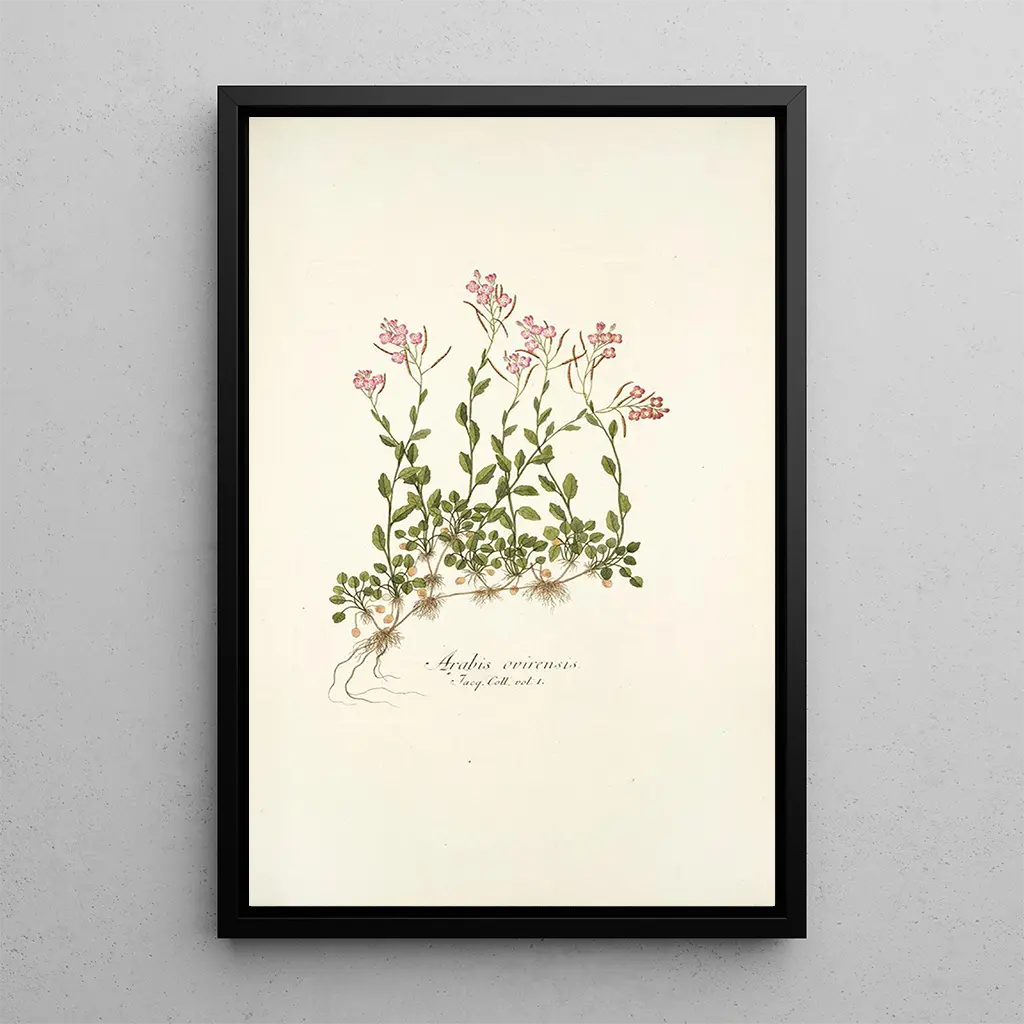 Nikolaus Joseph Freiherr von Jacquin, botanist en kunstenaar uit de achttiende eeuw, wist wetenschap en kunst te combineren in zijn werken. Opgeleid aan de Universiteit van Wenen, werd hij beïnvloed door de botanische ontdekkingen van zijn tijd, vooral tijdens zijn reizen in Zuid-Amerika. Jacquin speelde een cruciale rol in de documentatie van plantensoorten en droeg zo bij aan de vooruitgang van botanische kennis. Zijn stijl, gekenmerkt door wetenschappelijke precisie en artistieke gevoeligheid, markeerde zijn tijd en blijft kunstenaars en natuurliefhebbers inspireren. De kunstdruk van Arabis ovirensis getuigt van zijn inzet om de schoonheid van de plantwereld vast te leggen.