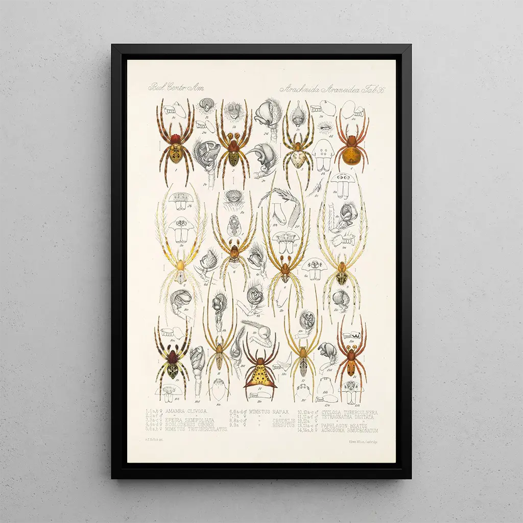 "**Arachnida Araneidea Pl 36**" van Frederick DuCane Godman is een kunstdruk die de essentie van spinnen in hun natuurlijke habitat vastlegt. Met een levendig kleurenpalet en een minutieuze aandacht voor details lijkt elke spin tot leven te komen op het web. De gebruikte techniek, die aquarel en tekening combineert, creëert een sfeer die zowel realistisch als poëtisch is. De sierlijke vormen van de spinnen, benadrukt door subtiele schaduwen, nodigen uit tot een visuele verkenning die de verborgen schoonheid van deze vaak verkeerd begrepen wezens onthult.