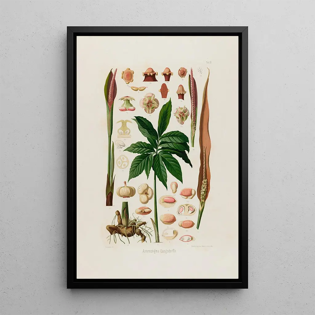 De kunstdruk Aroideae Maximilianae Pl23, vervaardigd door Heinrich Wilhelm Schott, is een boeiende illustratie die de schoonheid van tropische planten viert. Met levendige kleuren variërend van stralend groen tot donkerdere tinten, roept deze reproductie een sfeer van weelderigheid en exotisme op. De aquareltechniek, met finesse toegepast, brengt de fijne details van de bladeren en bloemen tot leven, waardoor een gevoel van diepte en vitaliteit ontstaat. Elk element van dit doek lijkt te vibreren onder het licht, en nodigt de kijker uit om onder te dompelen in een fascinerend botanisch universum.