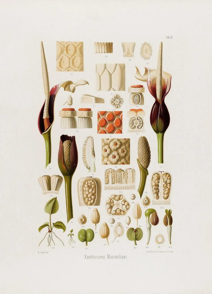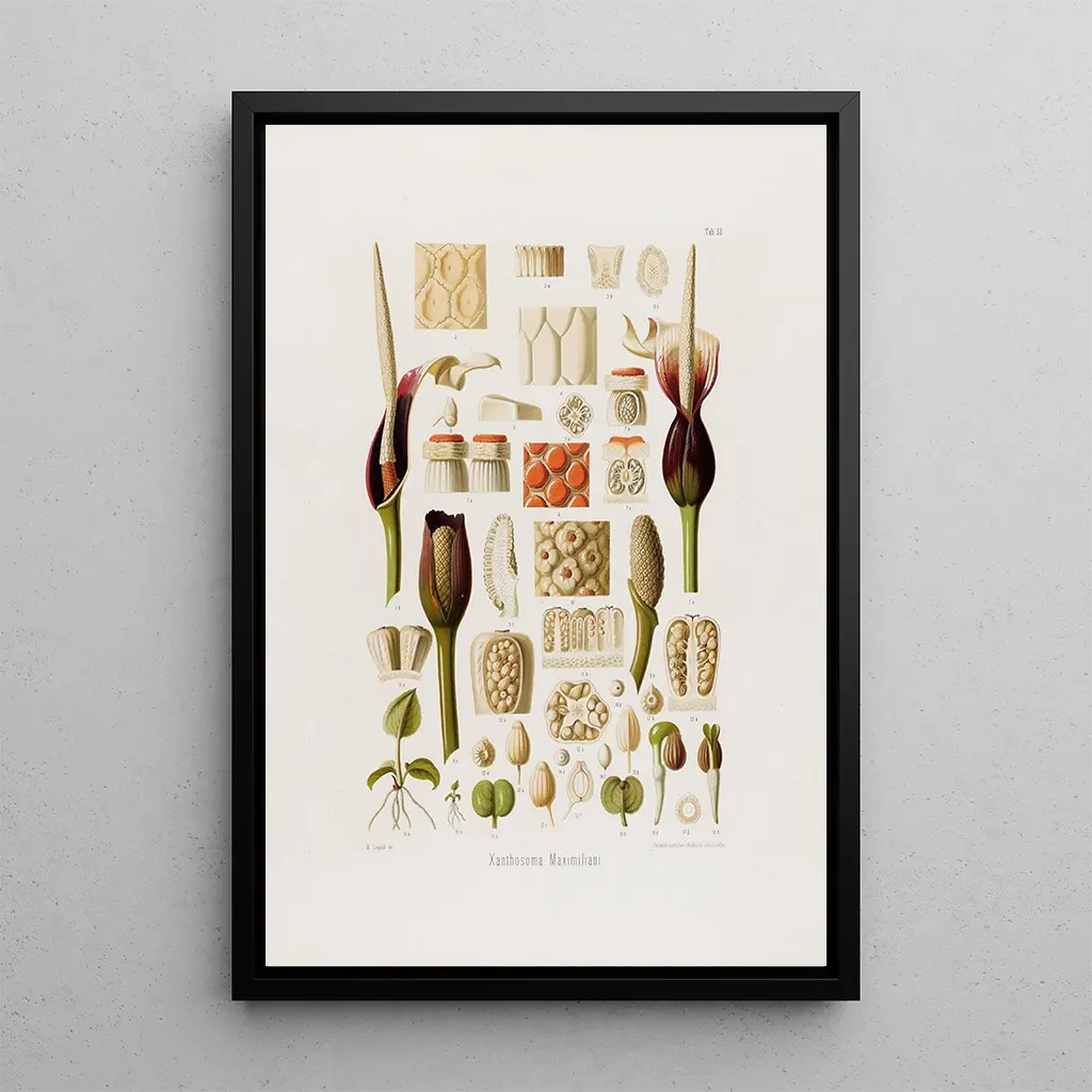 L'œuvre "Aroideae Maximilianae Pl33" de Heinrich Wilhelm Schott nous plonge dans un univers botanique fascinant. Deze kunstdruk benadrukt een plant met een unieke schoonheid, met minutieuze details die de complexiteit van zijn bladeren en bloemen onthullen. De levendige kleuren, variërend van diepe groenen tot sprankelende tinten, creëren een levendige en dynamische sfeer. De graveertechniek die door Schott wordt gebruikt, stelt ons in staat niet alleen de fysieke verschijning van de plant vast te leggen, maar ook haar essentie, en nodigt de kijker uit om de rijkdom van de biodiversiteit te waarderen. Elk element van dit doek lijkt de levensenergie te ademen, en transporteert ons naar een weelderige tuin.