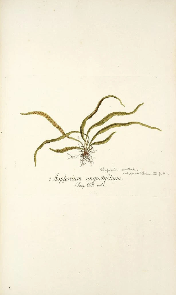 Nikolaus Joseph Freiherr von Jacquin, botanist en kunstenaar uit de 18e eeuw, markeerde zijn tijd met zijn bijdragen aan wetenschap en kunst. Geboren in 1727 in Oostenrijk, werd hij beïnvloed door de wetenschappelijke ontdekkingen van zijn tijd en door reizen die hem leidden tot het verkennen van exotische flora. Zijn kunstdrukken, zoals "Asplenium angustifolium", zijn niet alleen botanische illustraties, maar ook getuigenissen van verwondering over de natuur. Jacquin wist wetenschappelijke nauwkeurigheid te combineren met artistieke gevoeligheid, waardoor hij een onmisbare figuur werd in de botanische illustratie. Zijn nalatenschap blijft voortleven en inspireert vele kunstenaars en wetenschappers.