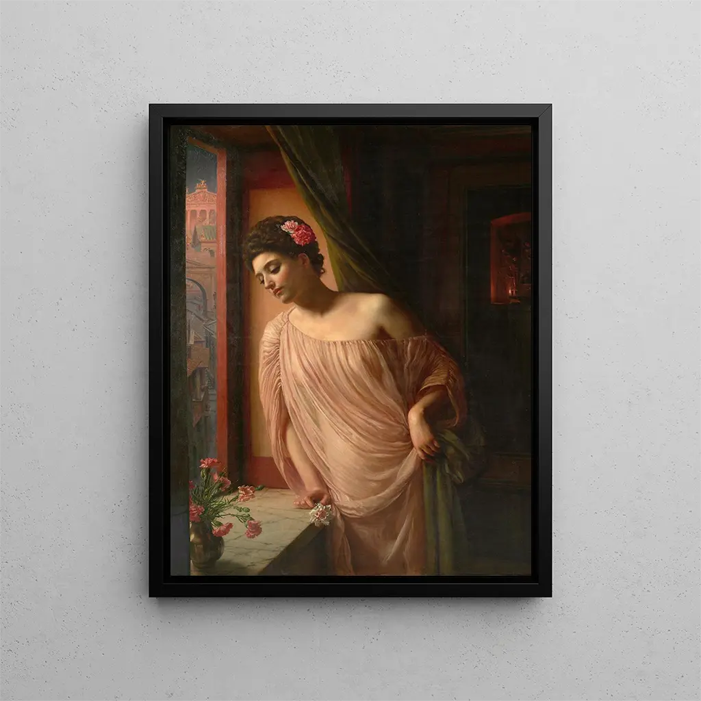 Le style de Poynter se caractérise par une maîtrise technique impressionnante, combinée à une sensibilité artistique qui lui est propre. Dans "Astéri", les détails minutieux des vêtements des personnages, la fluidité des drapés et la délicatesse des expressions faciales témoignent de son habileté à rendre la vie sur la toile. Les teintes pastel, presque éthérées, créent une atmosphère rêveuse, tandis que la lumière douce qui baigne la scène accentue l'intensité émotionnelle de l'œuvre. Ce tableau ne se contente pas de représenter une scène ; il évoque une expérience, une invitation à plonger dans un monde où chaque élément raconte une histoire, où chaque regard échangé entre les personnages révèle des sentiments profonds et complexes.