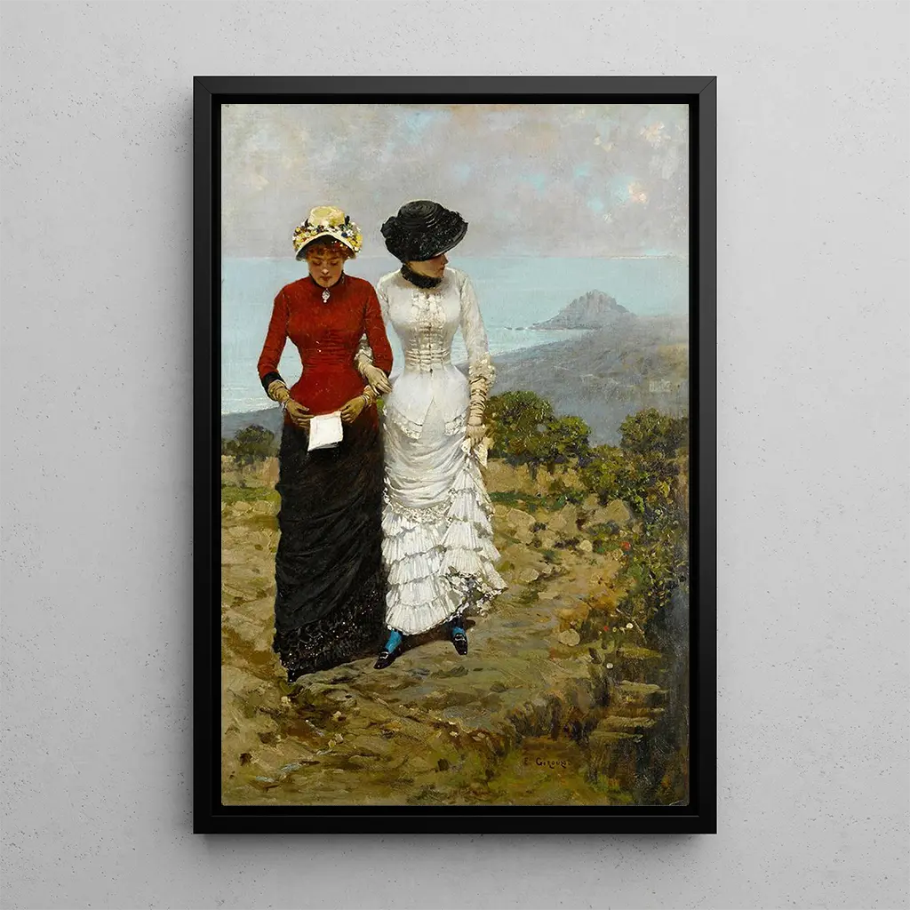 Naderen van de afspraak: een scène uit het leven doordrenkt met tederheid In "Naderen van de afspraak" vangt Ernest Giroux een vluchtig moment, een ontmoeting vol beloftes. De compositie benadrukt een jonge vrouw, gekleed in een delicate jurk, die gracieus naar een ontmoetingspunt wandelt. De pastelkleuren, die zachte tinten roze en blauw mengen, creëren een romantische en dromerige sfeer. De techniek van Giroux, die realisme en impressionisme combineert, brengt deze scène tot leven en maakt de emotie die ervan uitgaat bijna voelbaar. De minutieuze details van de bloemen en de omliggende bladeren voegen een vleugje poëzie toe, en nodigen de kijker uit zich onder te dompelen in dit hangende moment. Ernest Giroux: een schilder met een hart voor de romantische beweging Ernest Giroux, actief in de 19e eeuw, is een opmerkelijke vertegenwoordiger van de Franse romantische beweging. Geïnspireerd door zijn tijdgenoten, ontwikkelt hij een stijl die de nadruk legt op emotie en gevoeligheid, weg van de academische conventies van zijn tijd. Zijn kunstwerken, vaak geïnspireerd door de natuur en menselijke relaties, getuigen van een zoektocht naar authenticiteit en schoonheid. Giroux wist de essentie van zijn tijd te vangen, gekenmerkt door een zoektocht naar individualiteit en gevoelens. Zijn kunstwerken, zoals "Naderen van de afspraak", zijn reflecties op het dagelijks leven, maar doordrenkt met een emotionele diepgang die nog steeds de toeschouwers van vandaag raakt. Een decoratief bezit met vele voordelen De kunstdruk van het schilderij "Naderen van de afspraak" is een decoratief stuk dat elke ruimte kan verfraaien, of het nu een woonkamer, kantoor of slaapkamer is. De kwaliteit van de reproductie en de trouw aan de originele kleuren maken van dit doek een ideale keuze voor liefhebbers van romantische kunst. De esthetische aantrekkingskracht van dit werk ligt in de capaciteit om emoties op te roepen en een warme sfeer te creëren. Door deze kunstdruk in uw interieur te integreren, geeft u uw ruimte een vleugje verfijning en poëzie, terwijl u het artistieke erfgoed van Ernest Giroux eert.