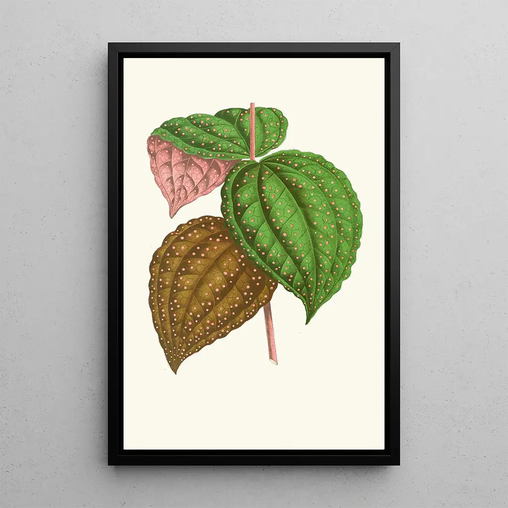 De kunstdruk van Bertolonia guttata dompelt ons onder in een botanisch universum waar nuances van groen samenvloeien met accenten van violet en wit. Dit doek, vervaardigd met een minutieuze techniek, roept een rustige en contemplatieve sfeer op. De details van de bladeren en bloemen, met precisie weergegeven, nodigen uit tot een visuele verkenning. Elk element van de compositie lijkt te vibreren onder het licht, waardoor een gevoel van leven en beweging ontstaat. De kunstenaar slaagt erin de essentie van deze plant vast te leggen, waardoor een venster op de schoonheid van de natuur wordt geopend.