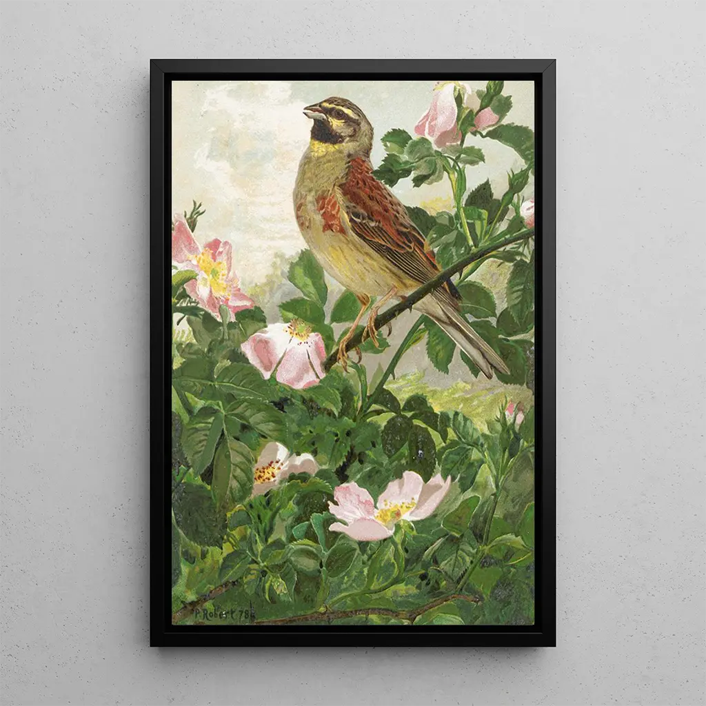 De kunstdruk van de Bruant zizi door Léon Paul Robert brengt ons naar een levendige tuin vol kleuren. Met heldere tinten geel, zwart en bruin slaagt de kunstenaar erin de essentie van deze zangvogel vast te leggen. De olieverftechniek maakt het mogelijk om de textuur van de veren en het licht dat speelt op de omliggende bladeren weer te geven. De sfeer is vrolijk en levendig, als een zachte melodie die door de lucht weerklinkt, uitnodigend tot contemplatie en verwondering over de schoonheid van de natuur.