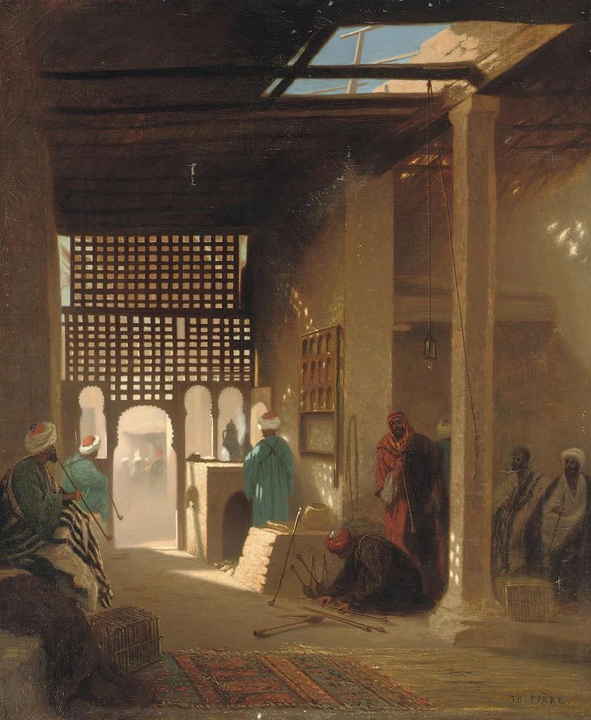 Reproductie Café maure - Charles Théodore Frère – Boeiende introductie In de fascinerende wereld van de orientalistische kunst onderscheidt "Café maure" van Charles Théodore Frère zich door zijn vermogen om de toeschouwer mee te nemen naar het hart van een levendige en sfeerbepalende scène. Dit werk, dat de zoetheid van het leven in een traditioneel café in de Maghreb oproept, nodigt uit tot een zintuiglijke onderdompeling waar warme kleuren en minutieuze details samenkomen om een sfeer te creëren die zowel intiem als betoverend is. De compositie, rijk aan narratieve elementen, maakt het mogelijk om niet alleen de esthetiek van die tijd te begrijpen, maar ook de culturele interacties die de kunst van de 19e eeuw hebben gevormd. Door deze kunstdruk wordt Frère's werk een venster naar een wereld waar de tijd lijkt stil te staan, wat uitnodigt tot contemplatie en ontsnapping. Stijl en uniekheid van het werk De stijl van Charles Théodore Frère wordt gekenmerkt door een uitzonderlijke beheersing van licht en kleuren. In "Café maure" slaagt hij erin de essentie van het Oosten vast te leggen door middel van warme tinten en delicate schaduwen die diepte aan de scène geven. De personages, gekleed in traditionele kostuums, worden zo nauwkeurig weergegeven dat ze onder de blik van de toeschouwer tot leven lijken te komen. De compositie is zorgvuldig in balans gebracht, elk element speelt een essentiële rol in de visuele vertelling. De architectonische details van het café, versierd met Arabesken, voegen een extra dimensie toe aan het werk en getuigen van de interesse van de kunstenaar voor exotische culturen. Deze minutieuze aandacht voor de contextuele elementen maakt van "Café maure" een iconisch werk dat verder gaat dan een eenvoudige decoratie en een ware reflectie wordt op identiteit en de ontmoeting van beschavingen. De kunstenaar en zijn invloed Charles Théodore Frère, geboren in 1814, was een Franse schilder wiens artistieke parcours diep werd beïnvloed door zijn interesse in het Oosten. Onvermoeibaar reiziger haalde hij zijn inspiratie uit de landschappen en levensscènes die hij tijdens zijn verblijven in Noord-Afrika ontmoette. Zijn werk, doordrenkt met een unieke gevoeligheid, weerspiegelt de invloeden van het Orientalisme, een artistieke beweging die veel kunstenaars van zijn tijd heeft geboeid. Door een verfijnde techniek te combineren met een narratieve aanpak