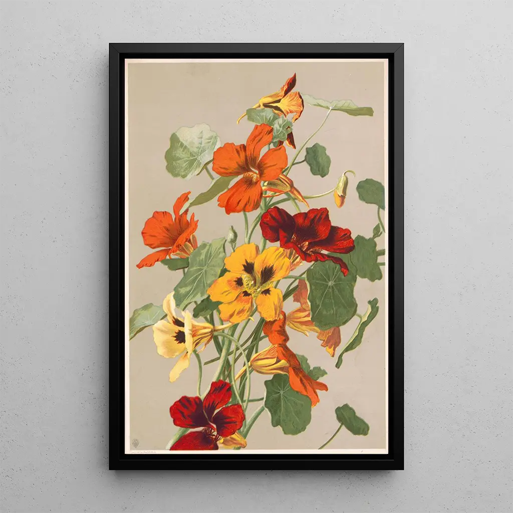 De capucines, met hun levendige tinten en hun delicate uitstraling, bloeien in dit kunstdruk van Louis Prang Co. De bloemrijke compositie is een waar festival van kleuren, waar rood, oranje en geel zich verweven om een vrolijke en levendige sfeer te creëren. De techniek van de kunstenaar, die lithografie en chromolithografische druk combineert, maakt het mogelijk om elke bloemblad met een sprankelende precisie weer te geven. Deze kunstdruk van een schilderij nodigt uit tot een rustgevende contemplatie, waarbij de schoonheid van de natuur wordt benadrukt en een moment van sereniteit biedt aan degenen die het bewonderen.