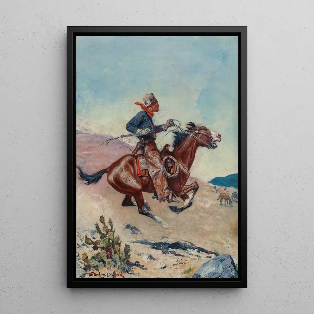 Stanley Llewellyn Wood, Britse schilder actief aan het einde van de 19e eeuw, wordt erkend om zijn werken die het Amerikaanse Westen en zijn legendes vieren. Geïnspireerd door de verhalen uit die tijd, wist hij de grootsheid van de landschappen en de ontembare geest van de personages die ze bewonen, vast te leggen. Zijn werken, vaak geïnspireerd door historische gebeurtenissen, getuigen van een periode waarin de kunstdruk "Pony Express" symbool stond voor snelheid en durf in communicatie. Wood wist zich te vestigen als een belangrijk kunstenaar van zijn tijd, door realisme en romantiek te combineren en zo iconische scènes uit de Amerikaanse geschiedenis tot leven te brengen.