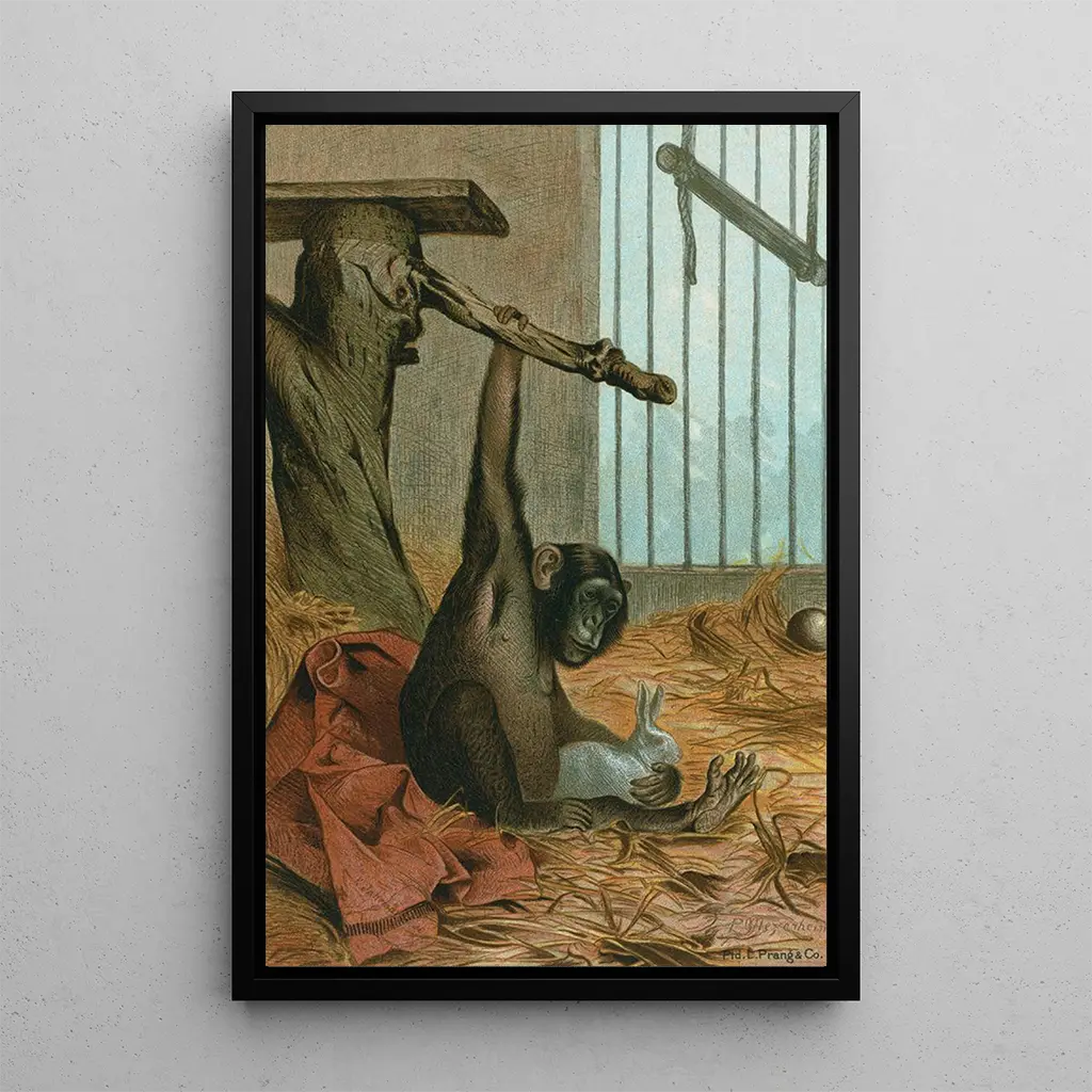 John George Wood, actief in de 19e eeuw, staat bekend om zijn illustraties van dieren die wetenschappelijke precisie combineren met artistiek gevoel. Geïnspireerd door de naturalistische beweging van zijn tijd, wist hij de schoonheid en complexiteit van de dierenwereld vast te leggen. Zijn werken, vaak gepubliceerd in wetenschappelijke werken, hebben bijgedragen aan het vergroten van het bewustzijn over fauna en flora. "Chimpanzé" maakt deel uit van deze aanpak, waarbij de kunstenaar niet alleen een dier afbeeldt, maar probeert een emotie en begrip voor het gedrag ervan over te brengen.