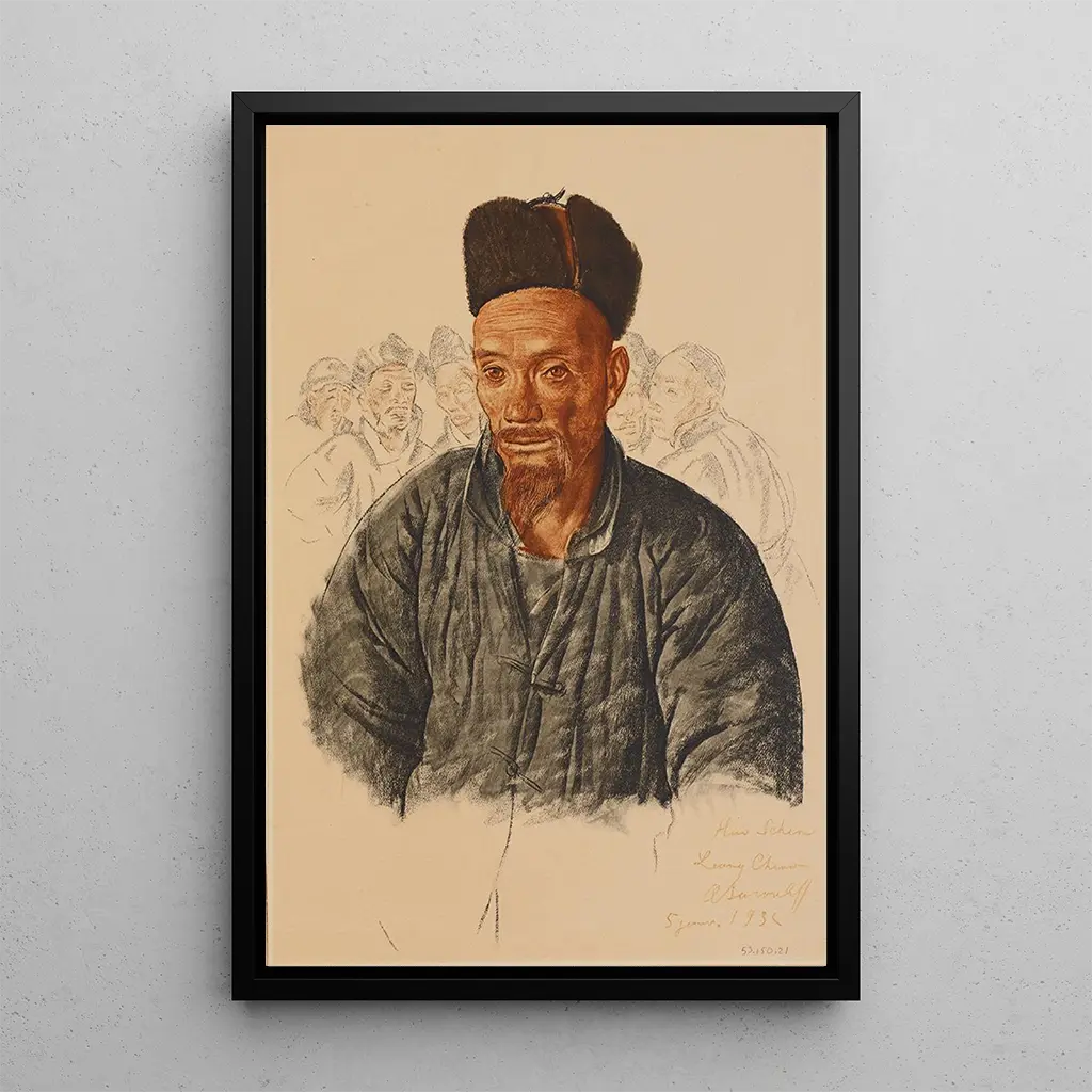 In deze kunstdruk van het schilderij Chinese Moslim van Liang-Tcheou dompelt Alexandre Iacovleff ons onder in een wereld vol kleuren en emoties. De compositie, tegelijk eenvoudig en treffend, benadrukt een centraal personage, wiens intense blik lijkt een verhaal te vertellen. De warme tinten, gemengd met nuances van rood en goud, creëren een levendige sfeer die onmiddellijk de aandacht trekt. De techniek van de kunstenaar, die precisie en vloeiendheid combineert, brengt dit portret tot leven en onthult de details van traditionele kleding en gelaatstrekken, terwijl het ook een zekere melancholie oproept.