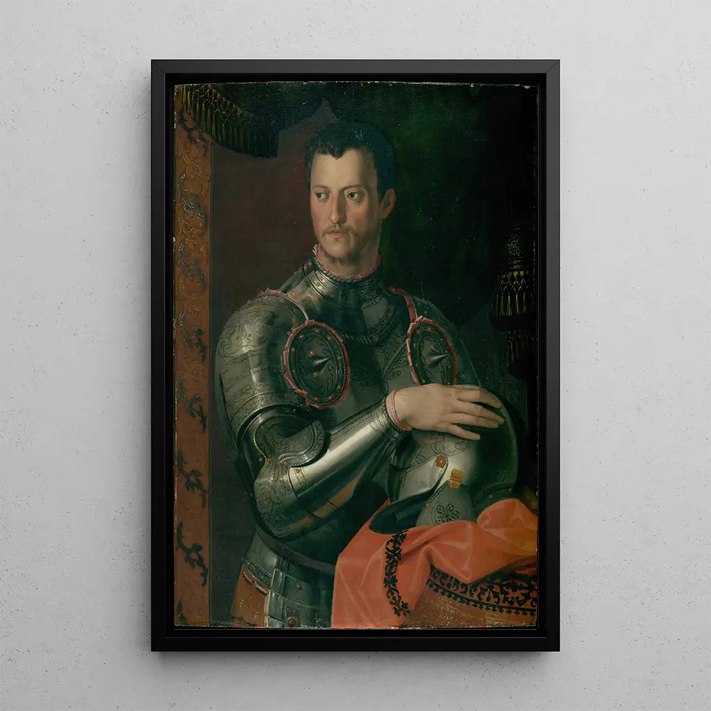 Agnolo Bronzino, een van de meest invloedrijke kunstenaars van de renaissance, wist de essentie van adel vast te leggen door zijn portretten. Voornamelijk actief in Florence, was hij de officiële schilder van het hof van de Médici, wat hem in staat stelde een unieke stijl te ontwikkelen, gekenmerkt door elegante lijnen en een verfijpt kleurenpalet. Bronzino werd beïnvloed door de werken van Michelangelo en Raphael, maar wist zijn eigen artistieke identiteit te smeden. Zijn werk, waaronder dit portret van Cosme Ier, getuigt van het belang van de voorstelling van macht en rijkdom in die tijd, terwijl het elementen van de humanistische cultuur van Florence integreert.