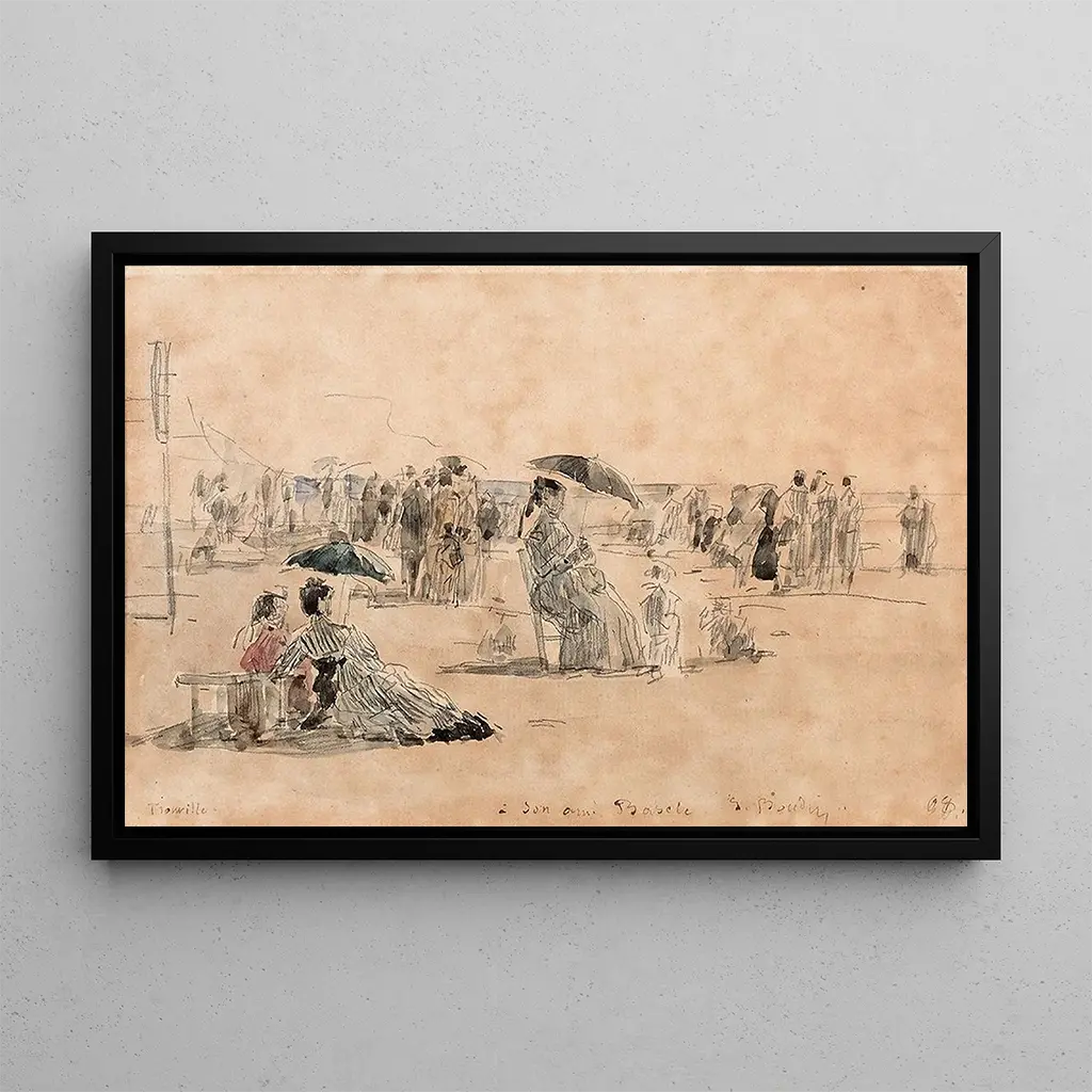 De kunstdruk van Crinolines op het Trouville-strand vangt een vluchtig moment uit het zomerse leven van de 19e eeuw. De majestueus uitgewaaierde crinolines dansen op de wind, terwijl de golven van de zee het strand strelen. De pastelkleuren en het zachte licht roepen een sfeer van geluk en lichtheid op, typisch voor zonnige dagen aan de Normandische kust. Het werk van Eugène Boudin, met zijn impressionistische techniek, slaagt erin een gevoel van beweging en levendigheid over te brengen, waardoor elk uitzicht een reis door de tijd wordt.