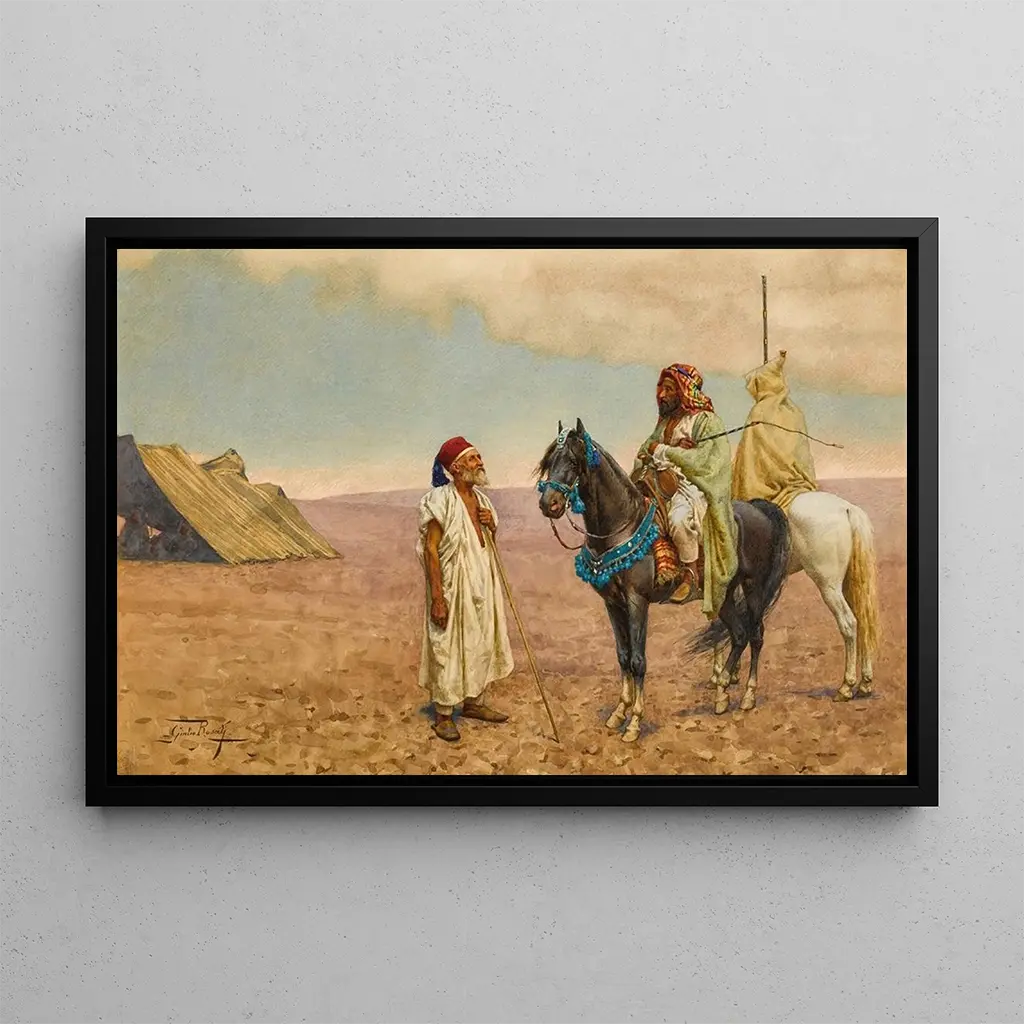 Le Messager : een ode aan de schoonheid van het dagelijks leven In "Le Messager" dompelt Giulio Rosati ons onder in een intieme scène waar het licht speelt met de schaduwen, waardoor de fijnheid van de details wordt onthuld. De compositie benadrukt een jonge man, gekleed in een traditionele tuniek, die lijkt een belangrijke boodschap over te brengen. De warme kleuren, gedomineerd door aardetinten en accenten van blauw, creëren een sfeer die zowel sereen als vol emotie is. De techniek van Rosati, die realisme en romantiek combineert, nodigt de kijker uit om de intensiteit van het moment te voelen, alsof men de fluistering van de kunstdruk kan horen. Giulio Rosati : een meester van de oosterse realisme Giulio Rosati, Italiaanse schilder uit de 19e eeuw, wordt erkend om zijn werken die de essentie van oosterse culturen vastleggen. Geïnspireerd door zijn reizen in Noord-Afrika en het Midden-Oosten, wist hij de schoonheid en complexiteit van deze regio's te vertalen in zijn kunst. Actief voornamelijk tussen 1870 en 1900, maakt Rosati deel uit van de oosterse realistische beweging die vele kunstenaars van zijn tijd heeft gefascineerd. Zijn stijl, gekenmerkt door oog voor detail en een rijke palet, getuigt van een tijd waarin het Oosten werd gezien als een plek vol mysterie en exotisme, en een venster bood op verre werelden. Een decoratief stuk met vele voordelen De kunstdruk van "Le Messager" is een decoratief stuk dat uw interieur zal verrijken, of het nu in een woonkamer, kantoor of slaapkamer is. De kwaliteit van de afdruk en de trouw aan de originele kleuren maken van deze doek een ideale keuze voor kunstliefhebbers. De esthetische aantrekkingskracht van dit werk ligt in zijn vermogen om nieuwsgierigheid op te wekken en gesprekken te stimuleren. Door deze afbeelding in uw decoratie te integreren, brengt u een vleugje elegantie en cultuur aan, terwijl u het talent van een kunstenaar viert wiens werk blijft resoneren door de tijd.
