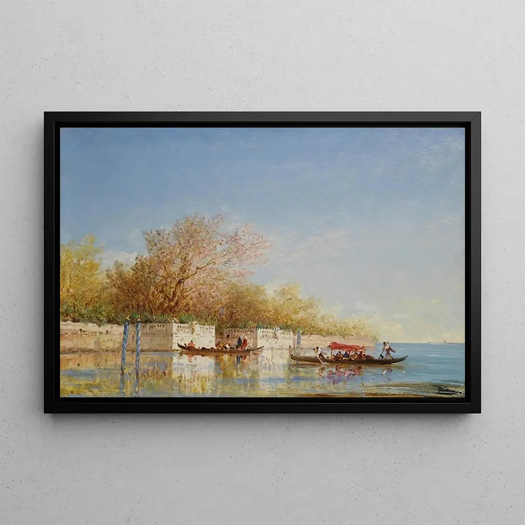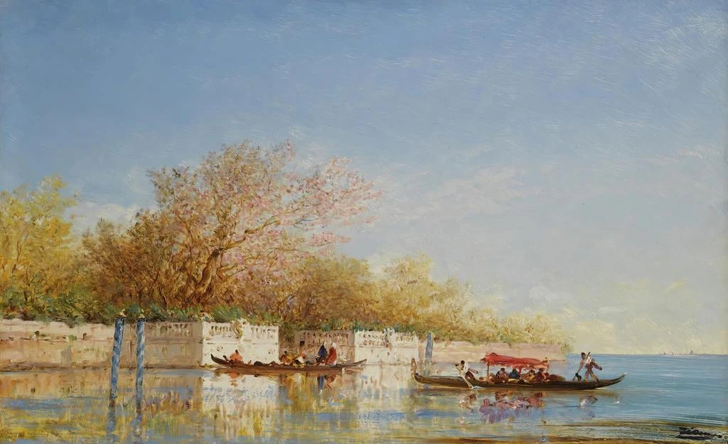 Dans Les jardins français, Félix Ziem nous invite à découvrir un paysage luxuriant où la nature s’épanouit dans toute sa splendeur. Cette toile, riche en détails, dépeint des jardins soigneusement entretenus, où les fleurs et les arbres s’entrelacent harmonieusement. Les couleurs vives et les jeux de lumière créent une atmosphère presque féerique, transportant le spectateur dans un monde de calme et de beauté. La technique de Ziem, mêlant impressionnisme et réalisme, permet de ressentir la douceur d’un après-midi ensoleillé, où chaque élément de la composition semble vibrer de vie.