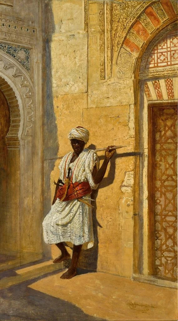 Le Garde est une œuvre qui évoque la tranquillité et la concentration d'un soldat en poste. À travers des nuances de vert et de brun, Ludwig Hans Fischer réussit à créer une atmosphère à la fois paisible et chargée de tension. La posture du garde, droite et attentive, attire immédiatement l'œil, tandis que le fond flou suggère un environnement en mouvement. Cette toile, par son équilibre entre le sujet et le décor, invite à la réflexion sur le devoir et la responsabilité, tout en offrant une esthétique plaisante et harmonieuse.