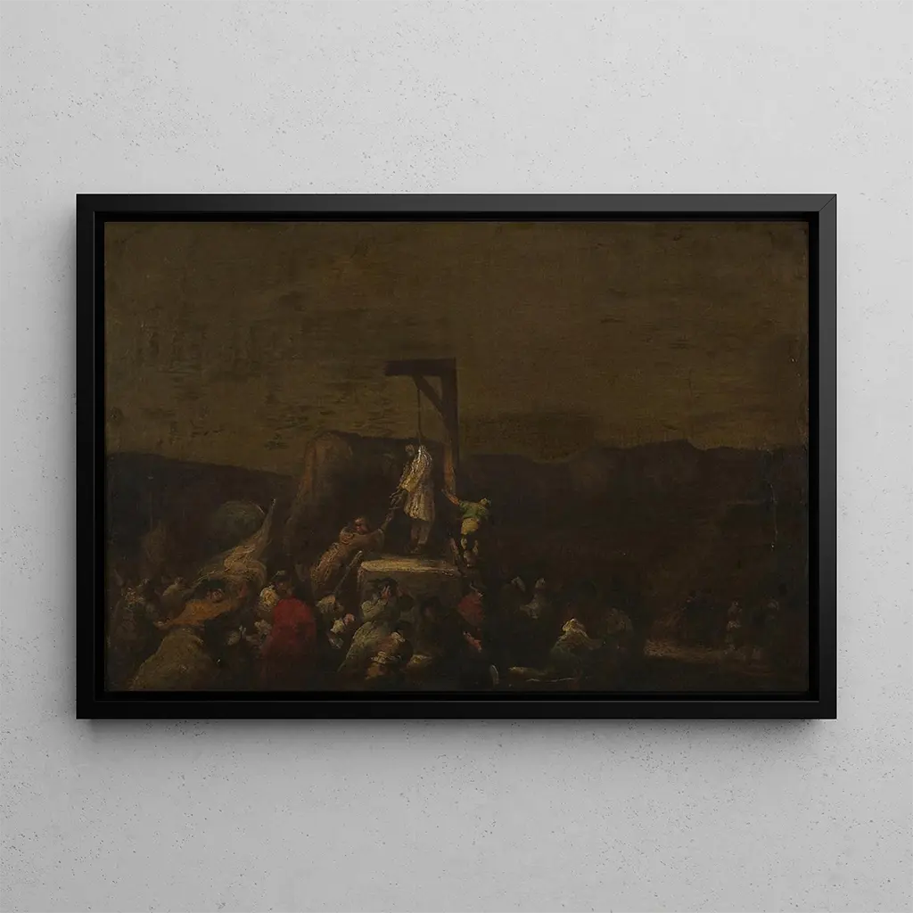 La Pendaison : een tragisch en aangrijpend tafereel De Pendaison, een kunstdruk van Eugenio Lucas Velázquez, beeldt een dramatisch tafereel uit waarin het tragische lot van een man zich afspeelt voor een geboeid publiek. De donkere kleuren en de benadrukte schaduwen creëren een sfeer van spanning en melancholie. De technische meesterschap van Velázquez komt tot uiting in de opvallende details van gezichtsuitdrukkingen en de houdingen van de personages, waardoor de scène des te emotioneler wordt. Dit doek, zowel krachtig als verontrustend, confronteert ons met de brute realiteit van de menselijke conditie en moedigt ons aan na te denken over rechtvaardigheid en moraliteit. Eugenio Lucas Velázquez : een meester van het Spaanse realisme Eugenio Lucas Velázquez, een Spaanse schilder uit de 19e eeuw, staat bekend om zijn werken die de thema's van het dagelijks leven en historische gebeurtenissen verkennen. Geïnspireerd door de romantiek, wist hij momenten van grote emotionele intensiteit vast te leggen, vaak geïnspireerd door de populaire cultuur en Spaanse tradities. Zijn stijl, gekenmerkt door een opvallend realisme, stelde hem in staat naam te maken in de kunstwereld, en zijn schilderijen worden nog steeds geprezen om hun vermogen om diepe en universele gevoelens op te roepen. Een decoratief kunstwerk met vele voordelen De kunstdruk La Pendaison vormt een boeiend kunstwerk dat uw interieurdecoratie zal verrijken. Of het nu in een woonkamer, kantoor of tentoonstellingsruimte is, dit schilderij trekt de aandacht en stimuleert gesprekken. De kwaliteit van de afdruk en de trouw aan het originele werk garanderen een indrukwekkend visueel resultaat, dat diepte en reflectie aan uw ruimte toevoegt. Met zijn dramatische sfeer en aangrijpende geschiedenis wordt dit doek een decoratief element dat zowel esthetisch als betekenisvol is.
