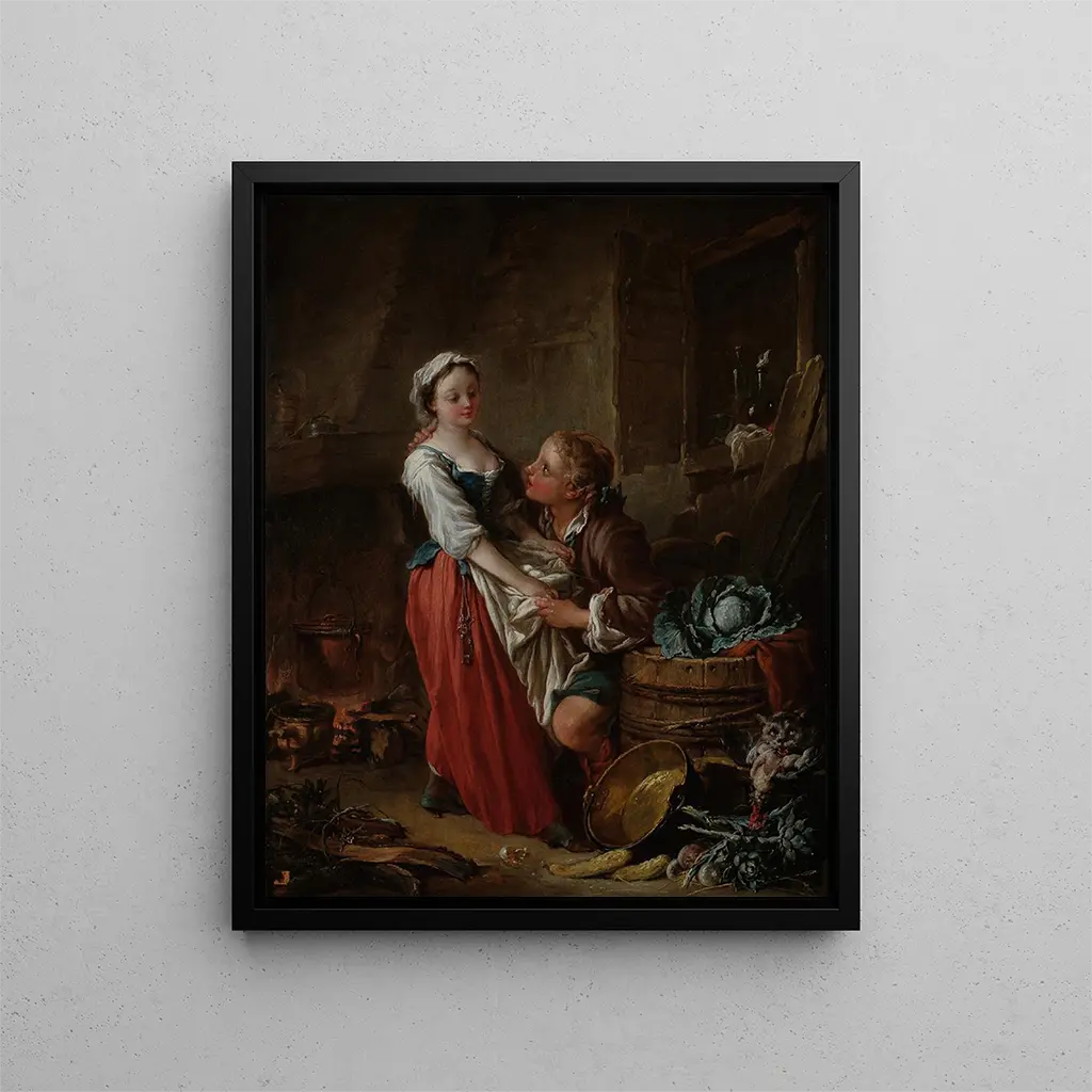 Reproductie La Belle Cuisinière - François Boucher – Boeiende introductie La Belle Cuisinière, iconisch werk van François Boucher, belichaamt op prachtige wijze de geest van de achttiende-eeuwse Franse kunst. Dit schilderij, dat een scène uit het dagelijks leven weergeeft met een vleugje sensualiteit en verfijning, dompelt ons onder in een wereld waar kunst en leven harmonieus samenkomen. Het doek, zowel intiem als theatraal, onthult een vrouw die aan het koken is, symbool van huiselijkheid en vrouwelijke schoonheid. Door deze kunstdruk La Belle Cuisinière - François Boucher nodigt de kunstenaar ons uit om de eenvoudige geneugten van het leven te waarderen, terwijl hij de virtuositeit van zijn talent viert. Stijl en uniekheid van het werk De stijl van François Boucher wordt gekenmerkt door een gedurfde kleurgebruik en een lichte penseelvoering die zijn werken tot levendige composities maken. La Belle Cuisinière vormt hierop geen uitzondering, met haar warme en heldere tinten die een vrolijke en gezellige sfeer creëren. De minutieuze details, zoals de texturen van de kleding en de reflecties van het licht op de keukengerei, getuigen van de vaardigheid van de kunstenaar om de realiteit vast te leggen en er bijna dromerige dimensies aan toe te voegen. De houding van de kokkin, zowel gracieuze als natuurlijk, roept een delicate sensualiteit op, terwijl ze de centrale rol van de vrouw in het huishouden benadrukt. Dit werk onderscheidt zich door een balans tussen realisme en idealisering, een dualiteit die de handtekening van Boucher is. De kunstenaar en zijn invloed François Boucher, geboren in 1703, is een van de meest invloedrijke schilders van de rococo-beweging. Zijn werk weerspiegelt niet alleen de smaak van zijn tijd, maar ook een persoonlijke visie op schoonheid en plezier. Boucher wist zich te profileren als de schilder van het hof, vooral onder het bewind van Lodewijk XV, waar hij talloze opdrachten voor de koning en de adel uitvoerde. Zijn stijl, gekenmerkt door dynamische composities en vaak mythologische onderwerpen, heeft de Franse schilderkunst beïnvloed en vele kunstenaars geïnspireerd. De kunstdruk La Belle Cuisinière, terwijl ze geworteld is in het alledaagse, getuigt van deze capaciteit om het banale te overstijgen en om te vormen tot kunst.