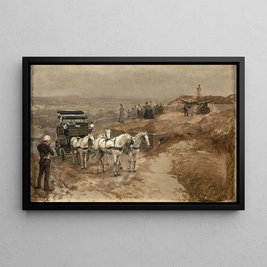 Le Siège de Paris 1871 : een aangrijpende kunstdruk uit de geschiedenis De schilderij "Le Siège de Paris 1871" van Jules Girardet legt met een opmerkelijke intensiteit de tumulten van de Frans-Duitse oorlog vast. De donkere en aardse kleuren domineren de compositie, wat een sfeer van wanhoop en veerkracht oproept. De personages, bevroren in dramatische houdingen, getuigen van het lijden en de angst die tijdens deze periode heersten. Girardet gebruikt olieverftechnieken die de details tot leven brengen, van door de beproeving getekende gezichten tot stedelijke landschappen in puin. Dit werk is een uitnodiging tot contemplatie, een aangrijpende herinnering aan de beproevingen die de Parijzenaars hebben doorstaan. Jules Girardet : een getuige van zijn tijd Jules Girardet, Franse schilder uit de 19e eeuw, wordt erkend om zijn historische en militaire werken. Opgeleid aan de École des Beaux-Arts in Parijs, was hij beïnvloed door het realisme en het romantisme, artistieke bewegingen die zijn tijd markeerden. Girardet slaagde erin om belangrijke momenten uit de geschiedenis vast te leggen, en "Le Siège de Paris 1871" is een treffend voorbeeld. Zijn vermogen om oorlogsscènes met zoveel emotie en precisie weer te geven, heeft hem een belangrijke plaats opgeleverd in het pantheon van kunstenaars van zijn tijd. Via zijn werken documenteerde hij niet alleen historische gebeurtenissen, maar verkende hij ook de psychologische impact van deze conflicten op individuen. Een decoratief stuk met vele voordelen De kunstdruk van "Le Siège de Paris 1871" is een decoratief stuk dat elk interieur kan verrijken, of het nu in een woonkamer, kantoor of slaapkamer is. De kwaliteit van de afdruk en de trouw aan de details van het originele werk maken het een ideale keuze voor kunst- en geschiedenisliefhebbers. Door dit schilderij in uw inrichting te integreren, brengt u een vleugje elegantie en diepte in uw ruimte. De esthetische aantrekkingskracht van dit doek ligt niet alleen in zijn geschiedenis, maar ook in zijn vermogen om sterke emoties op te roepen, waardoor elk moment van kijken een moment van reflectie en contemplatie wordt.