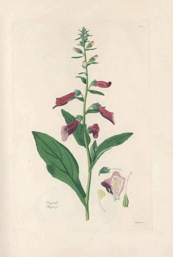 John Lindley, Britse botanist en tuinier uit de 19e eeuw, is een iconische figuur in de plantkunde. Zijn werk werd beïnvloed door de ontdekkingen van zijn tijd, gekenmerkt door een groeiende fascinatie voor botanica en de verkenning van exotische gebieden. Lindley speelde een cruciale rol in de classificatie van planten en droeg bij aan de oprichting van botanische tuinen. Zijn werken, zoals Digitalium monographia Pl04, getuigen van het belang van botanica in de Victoriaanse cultuur, waar kunst en wetenschap samenkomen om ons begrip van de natuurlijke wereld te verrijken.