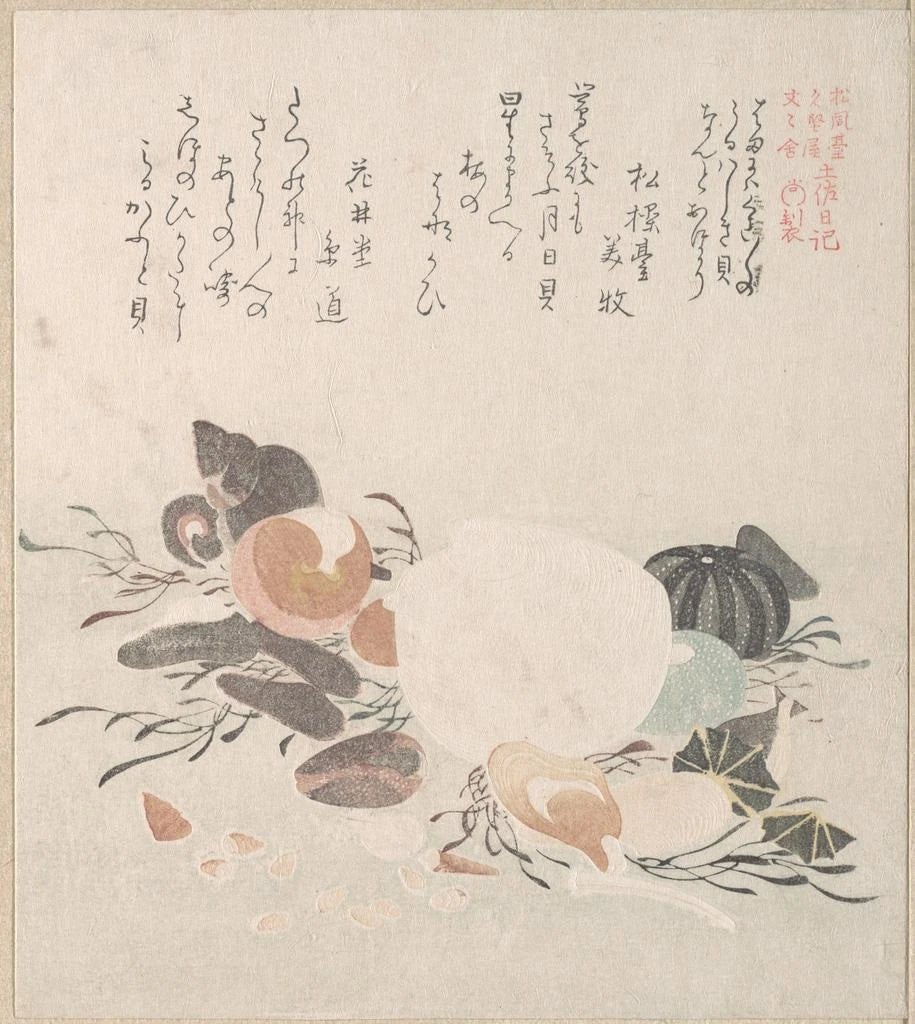 Diverse schelpdieren met zeewier - Kubo Shunman