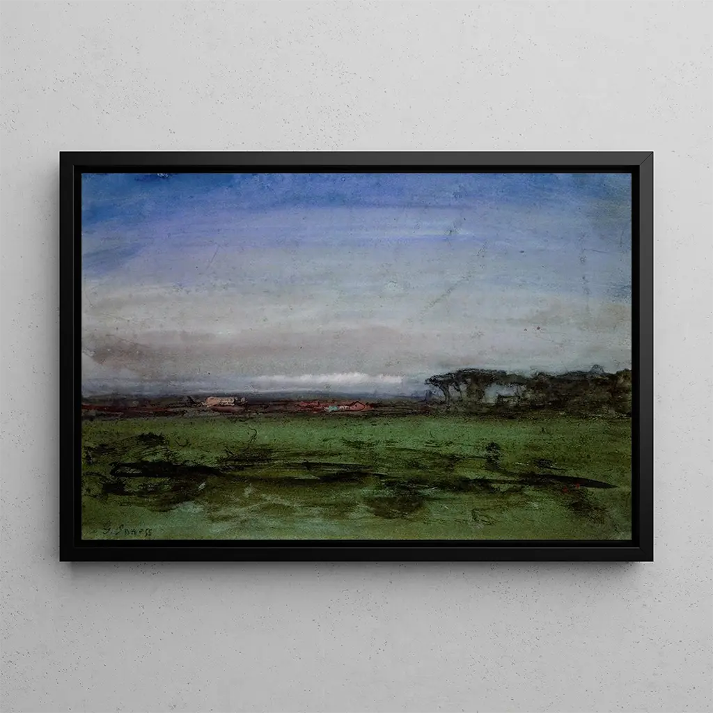 Door de Campagne : een ode aan de rustige natuur In dit werk brengt George Inness ons naar het hart van een vredig plattelandslandschap. De compositie, gedomineerd door zachte tinten groen en bruin, roept een rustgevende, bijna meditatieve sfeer op. De delicate penseelstreken en het diffuse licht creëren een harmonieuze balans tussen de hemel en de aarde. De majestueuze bomen, golvende velden en bewolkte hemel mengen zich tot een scène waarin de tijd lijkt stil te staan. Dit doek, een ware uitnodiging tot contemplatie, herinnert ons aan de eenvoudige en tijdloze schoonheid van de natuur. George Inness : de meester van het Amerikaanse landschap George Inness, iconische figuur van het Amerikaanse landschap van de 19e eeuw, wist de essentie van de natuur vast te leggen met een unieke gevoeligheid. Geïnspireerd door de romantische beweging en de spirituele filosofieën van zijn tijd, ontwikkelde hij een stijl die de eenvoudige voorstelling overstijgt. Zijn werken, vaak geïnspireerd door Europese landschappen, getuigen van een zoektocht naar licht en harmonie. Inness was ook een pionier in het gebruik van kleur om emoties op te roepen, wat zijn tijd markeerde en vele kunstenaars beïnvloedde. Zijn nalatenschap blijft bestaan, waardoor hij een onmisbare figuur is in de kunstgeschiedenis. Een decoratief stuk met vele voordelen De kunstdruk van "Door de Campagne" is een ideale decoratieve keuze om je interieur te verrijken. Of het nu in een woonkamer, kantoor of slaapkamer is, dit doek brengt een vleugje rust en natuurlijke schoonheid. De kwaliteit van de kunstdruk garandeert een trouwheid aan de details en kleuren van het originele werk, zodat je dagelijks kunt genieten van zijn esthetische aantrekkingskracht. Door dit werk in je inrichting te integreren, creëer je een gastvrije en inspirerende ruimte, waar elke blik verdwaalt in de betoverende scène van dit landschap.