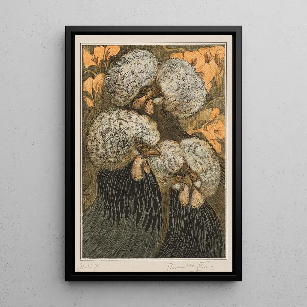 In deze kunstdruk van Drie kuikens met kuif biedt Theo van Hoytema ons een charmante en levendige scène, waar de kippen, met hun gekleurde veren en nieuwsgierige houding, onder onze ogen tot leven lijken te komen. De minutieuze details van elk dier, gecombineerd met zachte en natuurlijke tinten, creëren een gezellige en vrolijke sfeer. De kunstenaar slaagt erin niet alleen de fysieke verschijning van de kippen vast te leggen, maar ook hun speelse karakter, waardoor dit werk zowel speels als poëtisch is. De evenwichtige compositie en de delicate achtergrond benadrukken deze vertrouwde dieren, en vieren zo de eenvoud van het plattelandsleven.