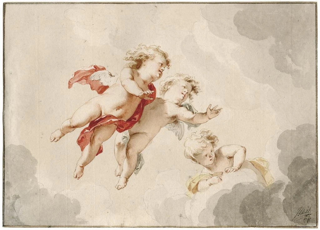 Dans cette œuvre captivante, Jacob de Wit nous transporte dans un univers aérien où trois putti, ces charmants petits anges, semblent flotter avec grâce. La composition est un véritable ballet de couleurs pastel, où les teintes douces de rose, de bleu et de crème se mêlent harmonieusement. La technique de la peinture à l'huile permet de rendre la délicatesse des visages et des drapés, créant une atmosphère à la fois joyeuse et rêveuse. Chaque détail, des expressions des putti aux nuances des ombres, contribue à l'impression d'une scène suspendue dans le temps, invitant le spectateur à s'émerveiller devant cette légèreté divine.