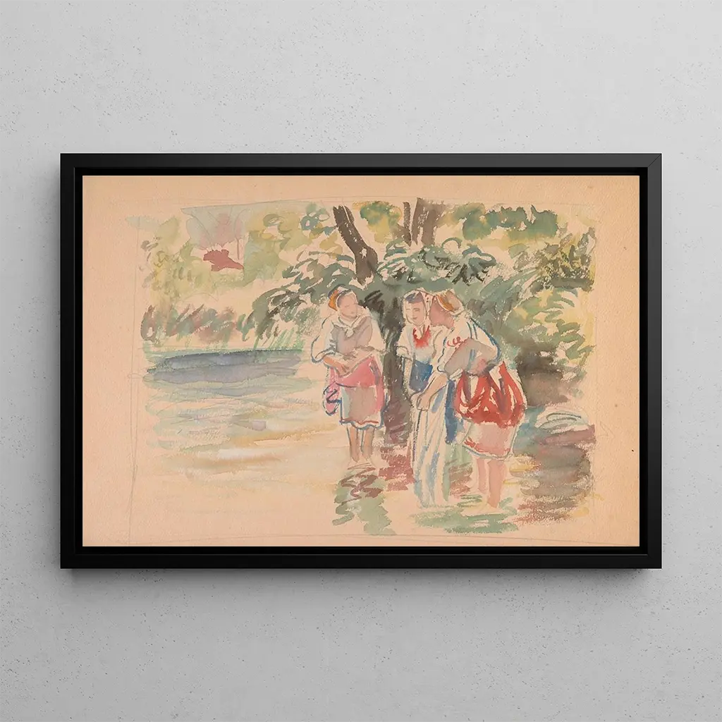 Deze kunstdruk van het schilderij "Drie vrouwen wandelend in de rivier" vormt een ideale decoratieve keuze voor diverse woonruimtes. Of het nu in een woonkamer, kantoor of slaapkamer is, deze doek brengt een vleugje sereniteit en frisheid in uw interieur. De afdrukkwaliteit garandeert een opmerkelijke trouw aan de kleuren en details van het originele werk, terwijl het een onmiskenbare esthetische aantrekkingskracht biedt. Door dit kunstwerk in uw inrichting te integreren, creëert u een rustgevende en inspirerende sfeer, ideaal voor ontspanning en contemplatie.