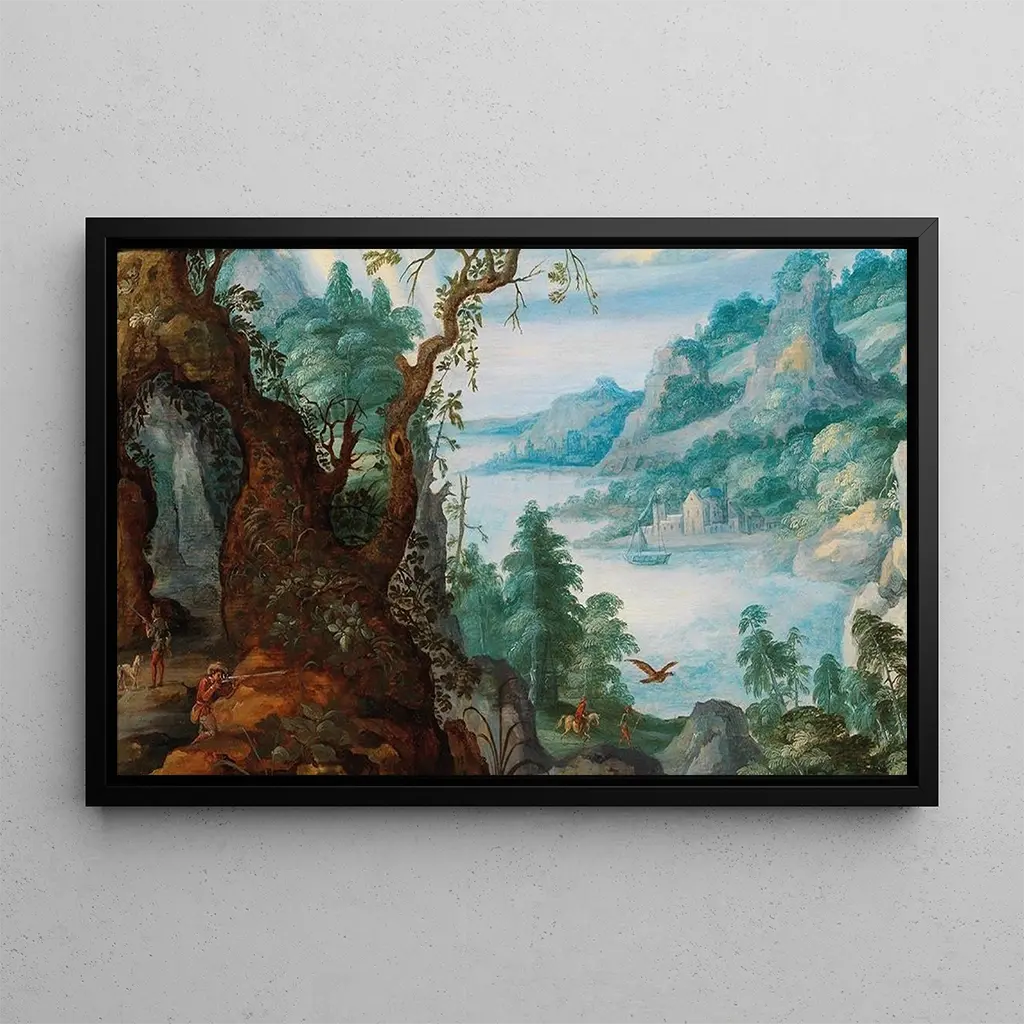 In deze kunstdruk van Een berglandschap met jagers brengt Marten Ryckaert ons naar het hart van een ongerepte en majestueuze natuur. Het doek beeldt een bergachtig landschap uit waar jagers, gekleed in historische kostuums, zich bewegen in een omgeving vol details. De tinten groen en bruin overheersen, wat de frisheid van de bossen en de kracht van de bergen oproept. Het zachte licht dat door de bomen filtert, creëert een rustige, bijna contemplatieve sfeer, die de kijker uitnodigt om zich onder te dompelen in de schoonheid van dit schilderij. Elk element, van jagers tot dieren, lijkt perfect geïntegreerd in dit levendige tableau.