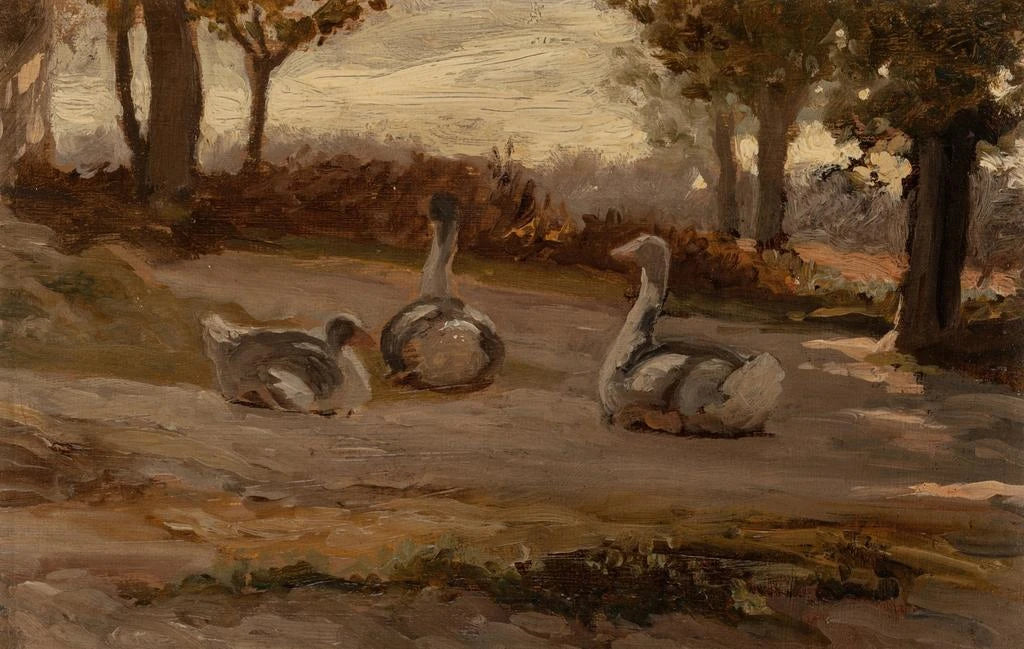 In deze kunstdruk van Elihu Vedder lijken de oies te dansen op het glinsterende oppervlak van een vijver, waardoor een rustige en contemplatieve sfeer ontstaat. De zachte en natuurlijke kleuren, variërend van rustgevende groenen tot warme bruintinten, roepen een perfecte harmonie op tussen de vogels en hun omgeving. De techniek van Vedder, gekenmerkt door delicate penseelstreken en een minutieuze aandacht voor details, brengt elke veer en elke reflectie op het water tot leven. Dit kunstwerk nodigt uit tot sereniteit en biedt een visuele ontsnapping naar een wereld waar de natuur heerst.