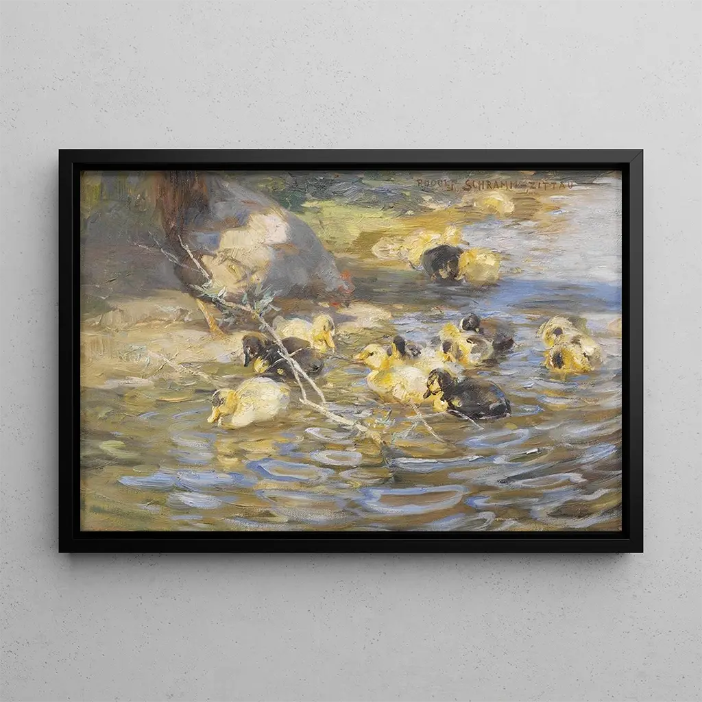 De kunstdruk Kanaries dompelt ons onder in een levendig schilderij, waar de natuur bloeit onder de penseelstreken van Rudolf Schramm-Zittau. De kanaries, afgebeeld in al hun pracht, bewegen zich in een serene wateromgeving, omringd door weelderige vegetatie. De levendige kleuren en de delicate details vangen de essentie van de fauna, en creëren een rustige en vrolijke sfeer. Elke penseelstreek lijkt een nieuw leven te geven aan deze vogels, en nodigt de kijker uit om de eenvoudige schoonheid van de natuur te waarderen.