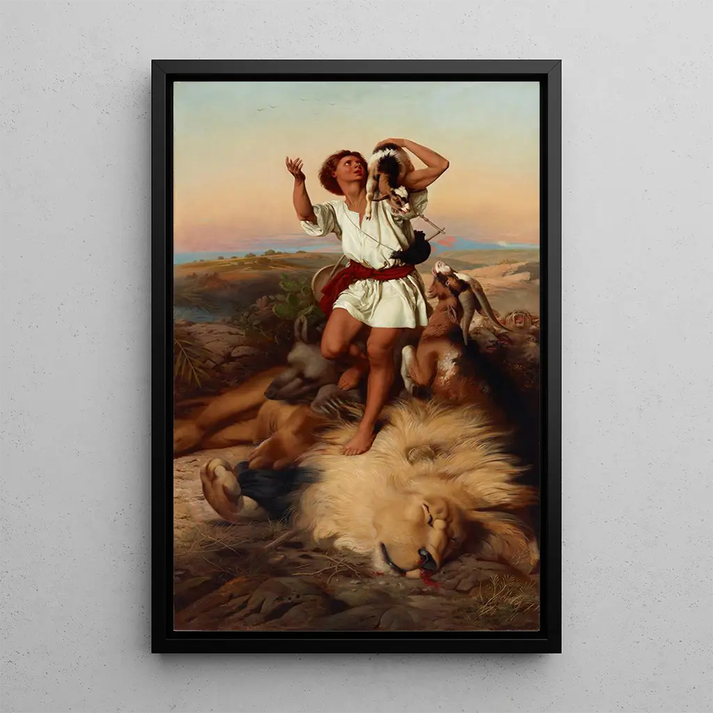 Eerste overwinning van David: een eerbetoon aan moed De kunstdruk "Eerste overwinning van David" van William Strutt vertegenwoordigt een historisch moment vol emotie en symboliek. In dit werk legt de schilder het moment vast waarop de held David, overwinnend, voor Goliath, zijn verslagen tegenstander, staat. De levendige kleuren en de opvallende contrasten benadrukken de dramatische spanning van de scène. De techniek van Strutt, die realisme combineert met narratieve elementen, brengt deze epische confrontatie tot leven. De sfeer is zowel triomfantelijk als plechtig, en nodigt de kijker uit om na te denken over moed en vastberadenheid. William Strutt: een kunstenaar in dienst van de geschiedenis William Strutt, Britse schilder uit de 19e eeuw, staat bekend om zijn historische kunstdrukken die belangrijke gebeurtenissen illustreren. Geïnspireerd door het romantisme, probeert hij krachtige verhalen over te brengen via zijn schilderijen. Zijn beheersing van tekenen en kleur stelt hem in staat om dynamische en evocatieve composities te creëren. "Eerste overwinning van David" past binnen een artistieke traditie die heldhaftige verhalen waardeert, terwijl het ook de zorgen van zijn tijd weerspiegelt, waaronder de groeiende interesse in geschiedenis en mythologie. Strutt slaagt erin de essentie van deze verhalen vast te leggen en ze toegankelijk te maken voor een breed publiek. Een decoratief kunstdruk met vele voordelen De kunstdruk van "Eerste overwinning van David" is een boeiende aanvulling op elke kunstcollectie, of deze nu wordt tentoongesteld in een woonkamer, kantoor of tentoonstellingsruimte. De afdrukkwaliteit garandeert een opmerkelijke fideliteit aan de details en kleuren van het originele werk, wat zorgt voor een verrijkende visuele ervaring. Door deze kunstdruk in uw interieur te integreren, brengt u een stukje geschiedenis en cultuur in huis, terwijl u gesprekken op gang brengt over dit iconische moment. Dit kunstwerk, door zijn visuele impact en krachtige boodschap, verrijkt de sfeer van elke leefruimte, en combineert esthetiek met reflectie.