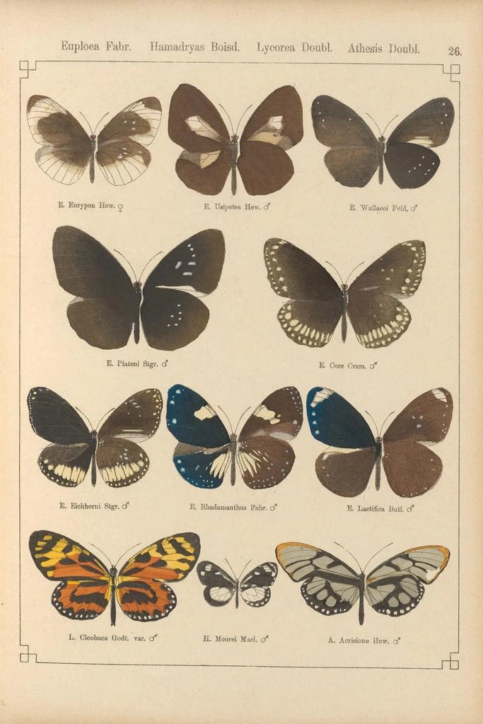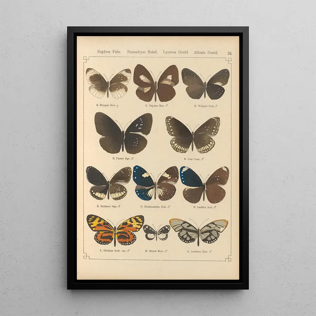 De kunstdruk Papillons exotiques Pl026 transporte ons naar een betoverende wereld waar de kleuren en vormen van de vlinders zich gracieus verweven. Dit werk, rijk aan details, toont specimens met diverse tinten, variërend van diepe roodtinten tot heldere groenen, en roept de diversiteit en schoonheid van de natuur op. De aquareltechniek, vakkundig toegepast, brengt deze delicate wezens tot leven en creëert een lichte, luchtige sfeer. Elke vlinder lijkt klaar om op te vliegen, en nodigt de kijker uit om zich te verwonderen over de pracht van de natuurlijke wereld.