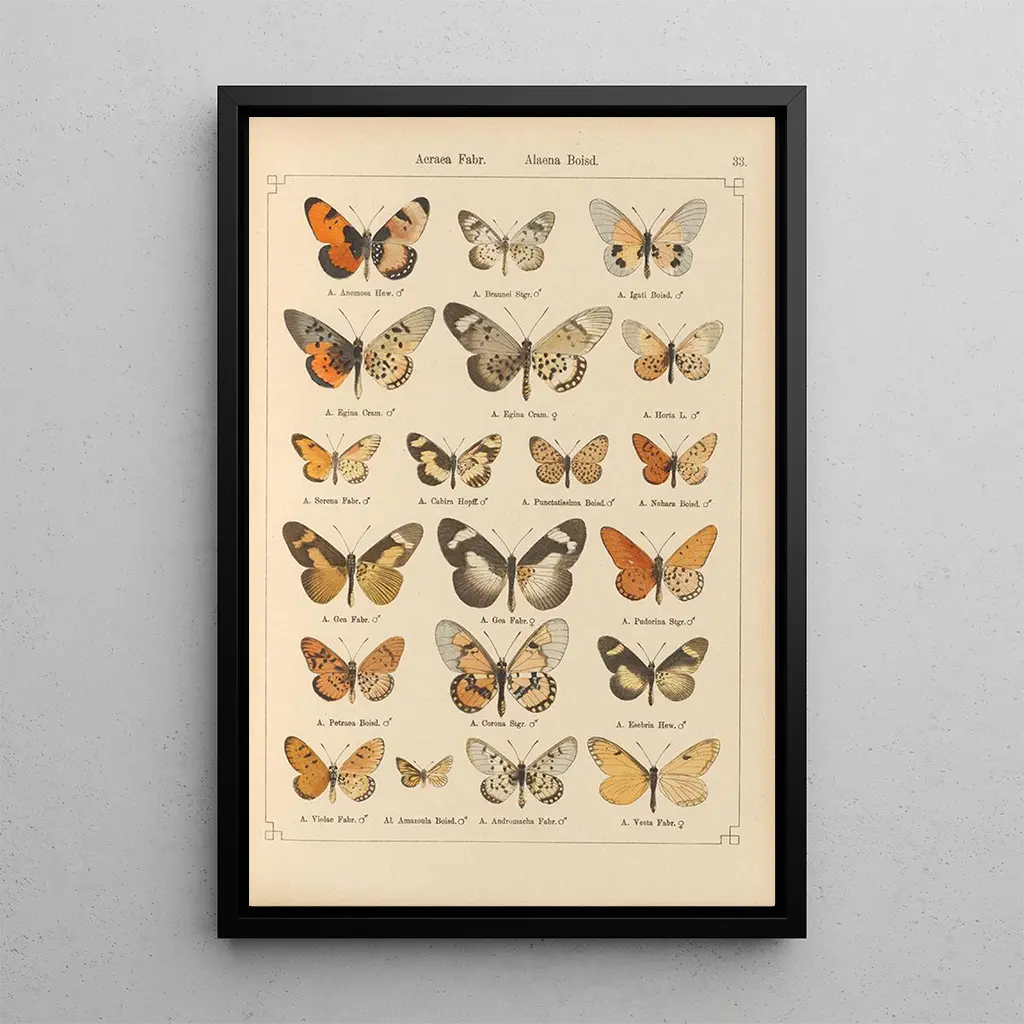 De kunstdruk van Papillons exotiques Pl033 brengt ons in een wereld waar de natuur zich uitdrukt met éclat en gratie. De vlinders, afgebeeld in al hun pracht, tonen levendige en gevarieerde tinten, variërend van vurend rood tot smaragdgroen. De techniek van Staudinger, die aquarel en tekening combineert, eert de fragiele schoonheid van deze wezens. Elk detail, van de patronen op de vleugels tot de delicate schaduwen, is zorgvuldig uitgewerkt, waardoor een sfeer ontstaat die zowel dynamisch als rustgevend is, perfect voor ontsnapping.