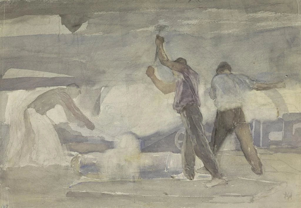 Pieter Josselin de Jong, actief in de 19e eeuw, is een iconisch vertegenwoordiger van het Nederlandse realisme. Opgeleid in de artistieke tradities van zijn tijd, wist hij impressionistische invloeden te integreren terwijl hij trouw bleef aan een getrouwe weergave van het dagelijks leven. Zijn werken, vaak gericht op scènes van arbeid, getuigen van een diep respect voor vakmanschap en het leven van de arbeiders. In een tijd waarin de industrialisatie toenam, wist Josselin de Jong de essentie van deze sociale transformaties vast te leggen door middel van een unieke artistieke bril, waardoor hij een belangrijke figuur van zijn tijd werd.