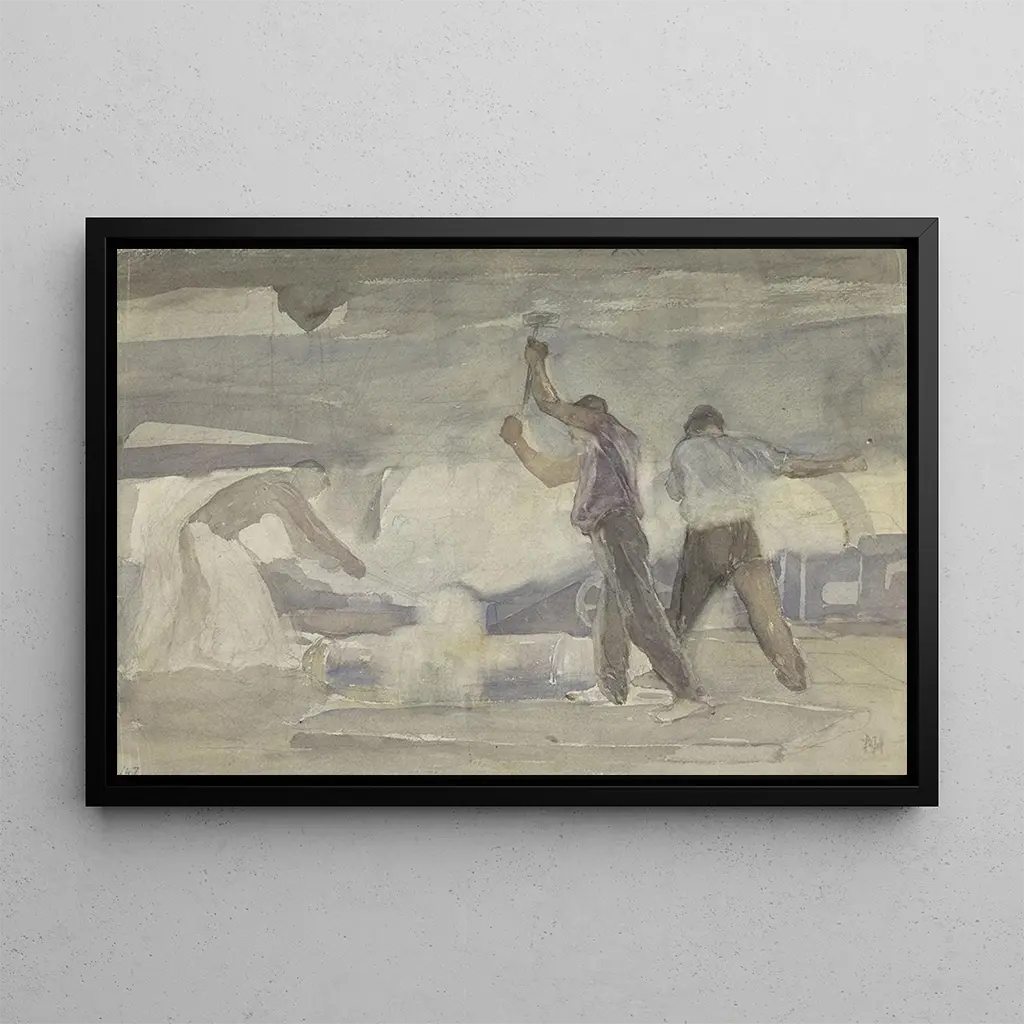 In deze kunstdruk van Forge dompelt Pieter Josselin de Jong ons onder in een wereld van hard werken, waar het licht speelt met de schaduwen van de smeden. De warme kleuren, gedomineerd door tinten rood en oranje, roepen de warmte van het vuur en de energie van menselijke inspanning op. De techniek van de kunstenaar, die realisme combineert met impressionistische accenten, creëert een levendige en dynamische sfeer, bijna tastbaar. Elk detail, van de adem van de smederij tot de geconcentreerde gezichten van de arbeiders, vertelt een verhaal van passie en toewijding, en nodigt de kijker uit om de intensiteit van dit moment, bevroren in de tijd, te voelen.