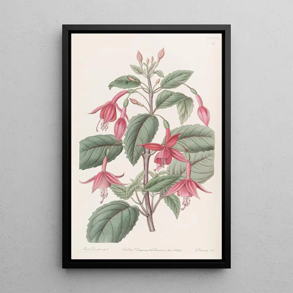 De kunstdruk van Fuchsia de Standish, vervaardigd door Sydenham Edwards, is een ware ode aan de schoonheid van de natuur. Dit doek onderscheidt zich door zijn levendige tinten roze, paars en groen, die zich verweven tot een harmonieuze en dynamische compositie. De delicate bloemen van fuchsia, met hun hangende bloemblaadjes, lijken bijna te dansen onder een zachte bries. De aquareltechniek die Edwards gebruikt, geeft het kunstwerk een lichtheid en transparantie, waardoor de kleuren subtiel over elkaar heen overlopen. De sfeer die uit dit werk straalt, is zowel vrolijk als rustgevend, en nodigt de kijker uit om onder te dompelen in een weelderige tuin.