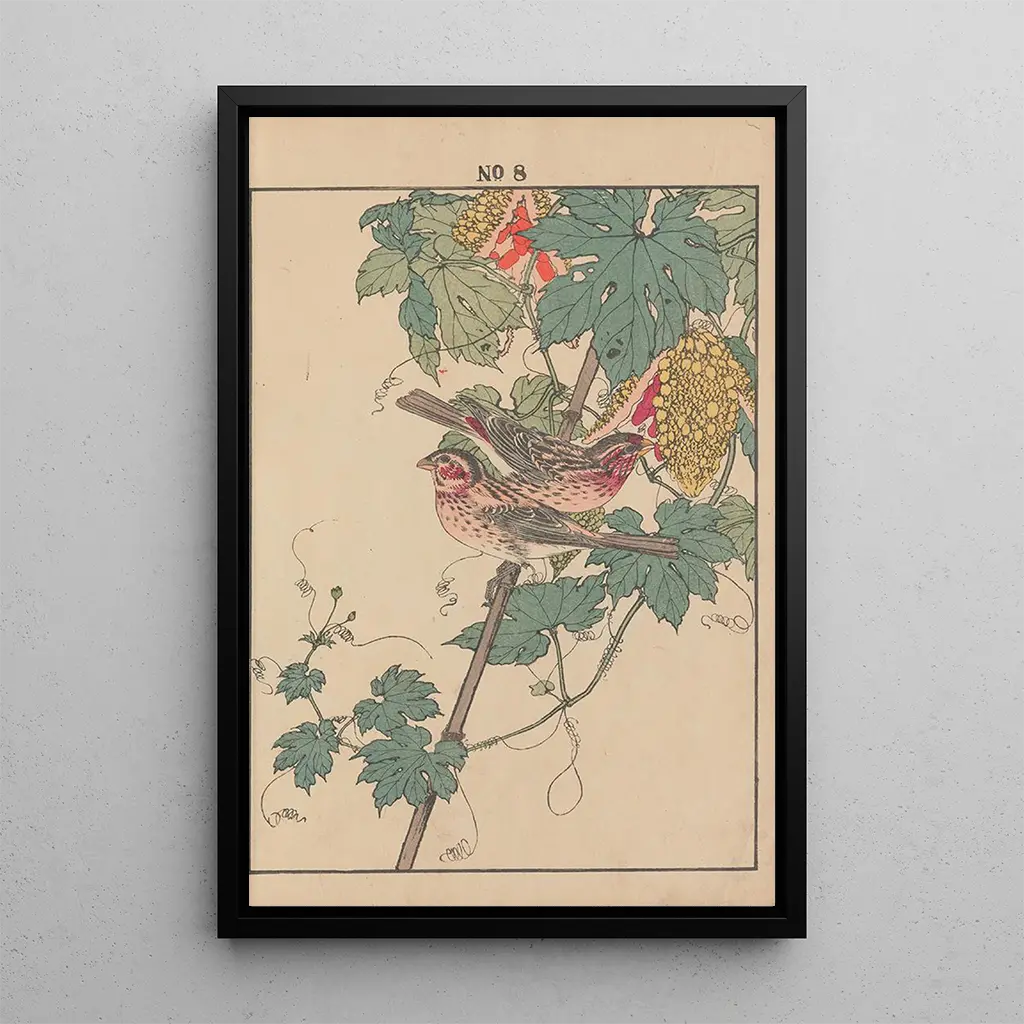 In deze kunstdruk van Keinen kach gafu Pl010 dompelt de kunstenaar Imao Keinen ons onder in een delicate wereld waar de natuur zich gracieus ontvouwt. De pastelkleuren, zacht en rustgevend, mengen harmonieus om een serene sfeer te creëren. De techniek van de ukiyo-e, typisch voor de Japanse kunst, stelt ons in staat de fijnheid van de details vast te leggen, van delicate bloemen tot weelderige bladeren. Elk element lijkt levend, en nodigt de kijker uit om zich onder te dompelen in deze idyllische scène, als een lichte wind die de bloemblaadjes streelt.