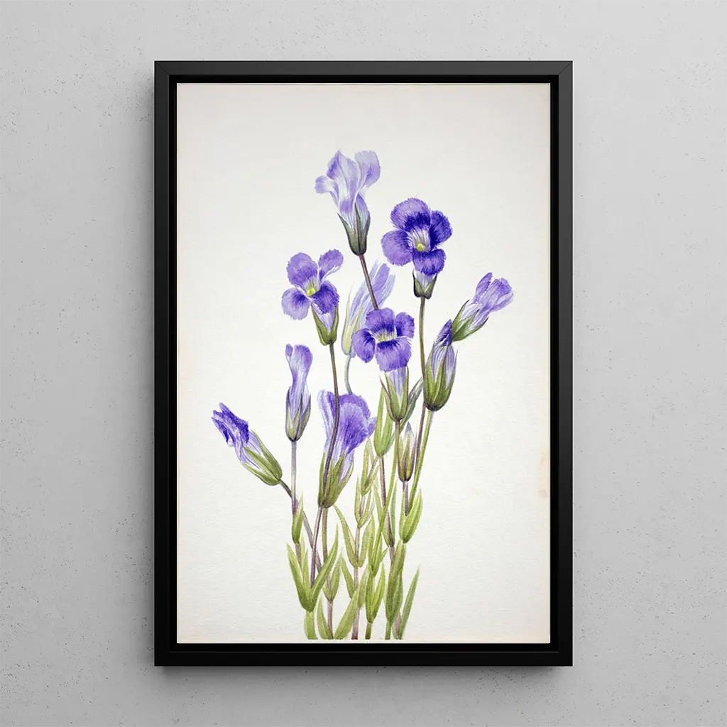 De gentiane frangée, of Gentiana elegana, wordt onthuld in een delicate compositie waarin de nuances van blauw en violet zich op een opmerkelijke fijnzinnige wijze verweven. De bloemblaadjes, met een bijna fluweelachtige textuur, vangen het licht en creëren een spel van schaduwen en reflecties die de zachtheid van alpiene landschappen oproepen. Mary Vaux Walcott slaagt er met haar minutieuze techniek in om deze bloem in al haar pracht te vereeuwigen, en schept een rustgevende en contemplatieve sfeer. Elk detail, van de nerven van de bladeren tot de contouren van de bloemen, getuigt van een diep respect voor de natuur en een passie voor observatie.