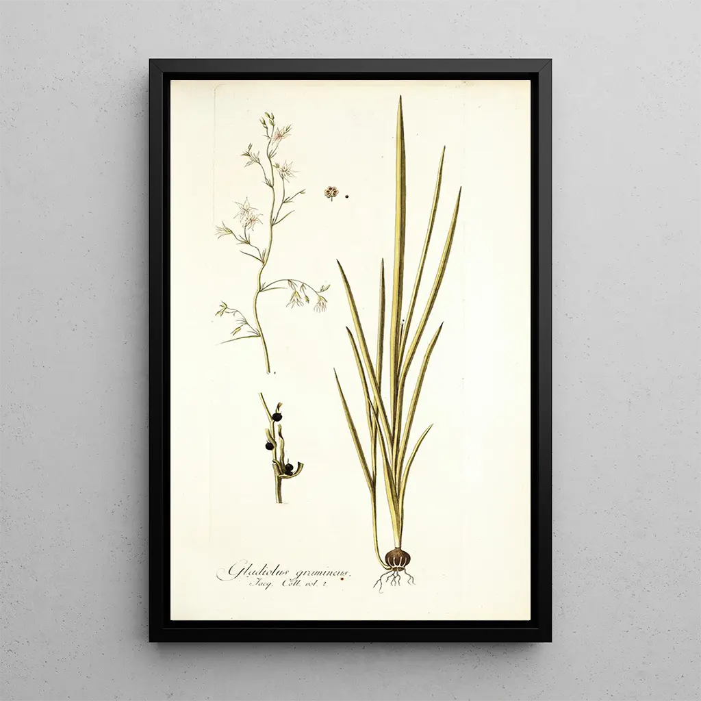 Het tableau Gladiolus gramineus, gemaakt door Nikolaus Joseph Freiherr von Jacquin, dompelt ons onder in een botanisch universum waar de schoonheid van bloemen wordt benadrukt met opmerkelijke precisie. De levendige kleuren van deze gladiolus, variërend van zachte groentinten tot sprankelende roze- en wittonen, creëren een sfeer die zowel rustgevend als verkwikkend is. De aquareltechniek, met finesse toegepast, maakt het mogelijk om de delicate details van de bloemblaadjes en bladeren vast te leggen, terwijl het geheel een lichte uitstraling krijgt. Dit tableau nodigt uit tot een aandachtige contemplatie, waarbij de complexiteit en elegantie van de natuur worden onthuld.
