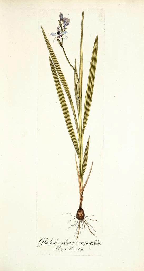 Nikolaus Joseph Freiherr von Jacquin, een iconische figuur uit de achttiende eeuw, wist zijn passie voor botanica en artistiek talent te combineren. Zijn grondige studies en reizen stelden hem in staat zeldzame plantensoorten te ontdekken, die hij vervolgens vastlegde in zijn werken. Gladiolus plicatus angustifolius is een perfect voorbeeld van zijn nauwgezette aanpak, waarbij elk detail met zorg wordt bestudeerd. Als botanist heeft Jacquin ook bijgedragen aan de vooruitgang van kennis over planten, waardoor hij een pionier is op het gebied van wetenschappelijke illustratie.