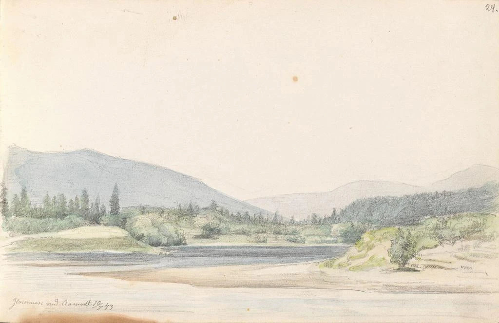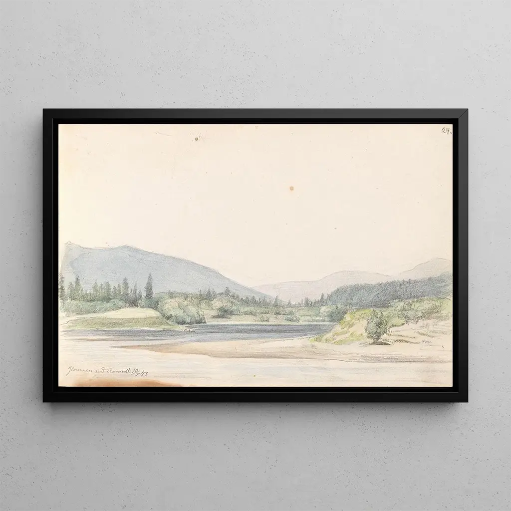 Dans "Glomma vers le sud", Adolph Tidemand nous transporte au cœur d'un paysage norvégien majestueux. La toile, baignée de lumière, révèle une rivière sinueuse entourée de montagnes imposantes et de forêts denses. Les couleurs vibrantes, allant des verts profonds aux bleus apaisants, créent une atmosphère sereine et contemplative. Tidemand, avec sa technique minutieuse, parvient à capturer la beauté brute de la nature, invitant le spectateur à s'évader dans ce tableau enchanteur. Chaque coup de pinceau semble respirer la tranquillité, faisant de cette œuvre une véritable célébration de la splendeur naturelle.