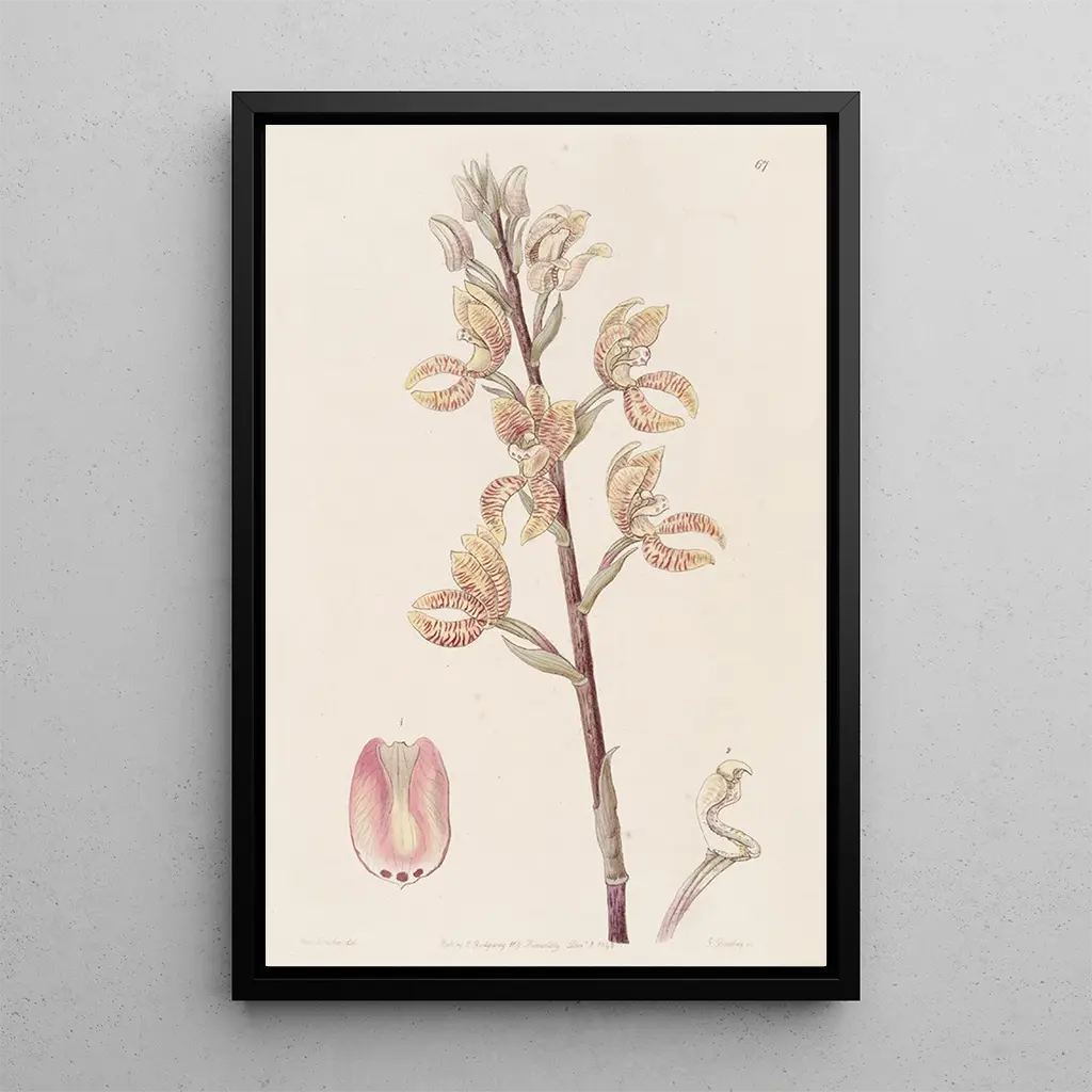 De kunstdruk van Govenia de Linden, vervaardigd door Sydenham Edwards, dompelt ons onder in een botanisch universum vol verfijning. De pastelkleuren mengen subtiel, waardoor een rustgevende en contemplatieve sfeer ontstaat. De precisie van de details, typerend voor botanische illustraties, benadrukt elke bloemblad en blad, en onthult de intrinsieke schoonheid van deze plant. De aquareltechniek, vakkundig toegepast, geeft het werk een lichtheid en transparantie die uitnodigen tot verwondering. Dit doek is veel meer dan een eenvoudige voorstelling; het roept de sereniteit op van weelderige tuinen en de rijkdom van de natuur.